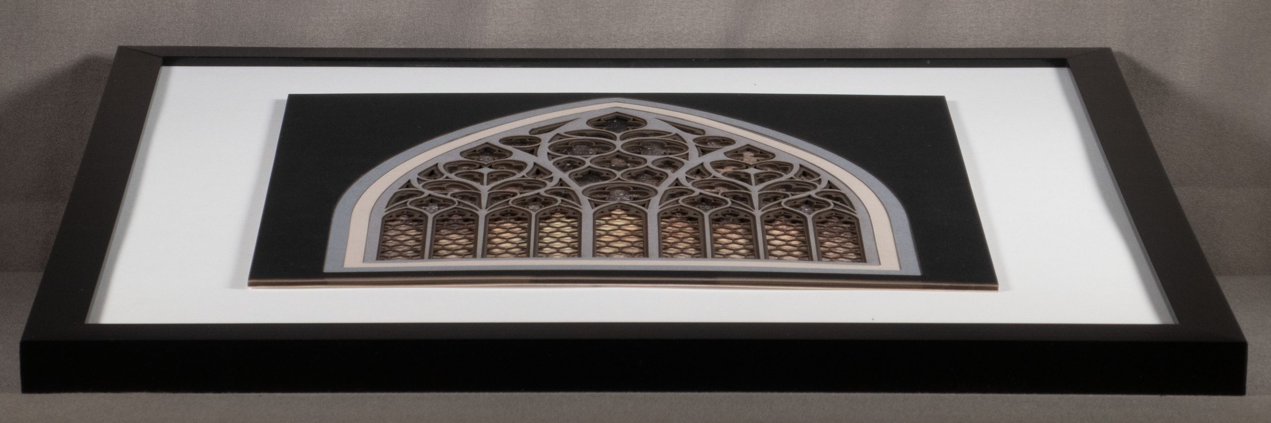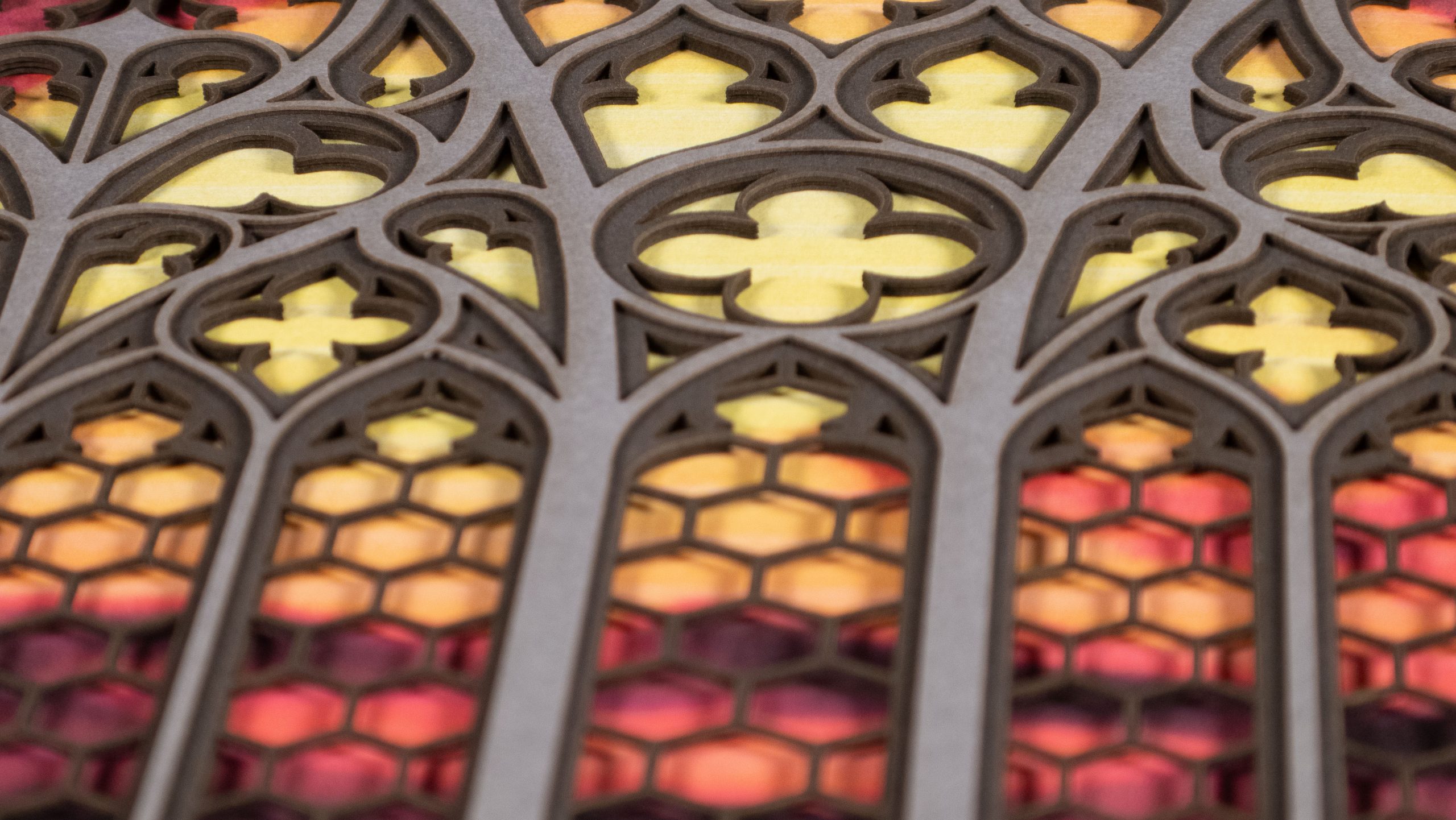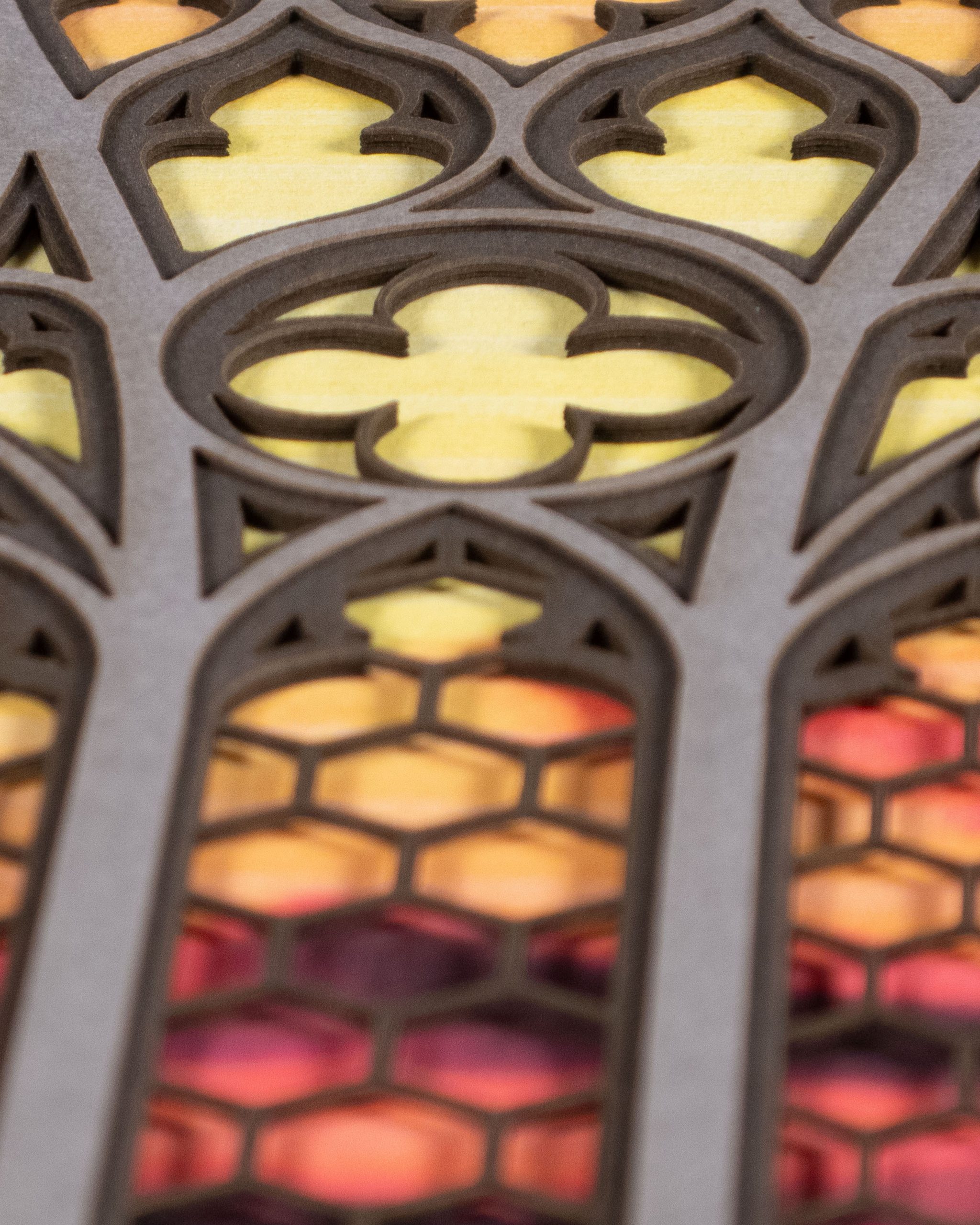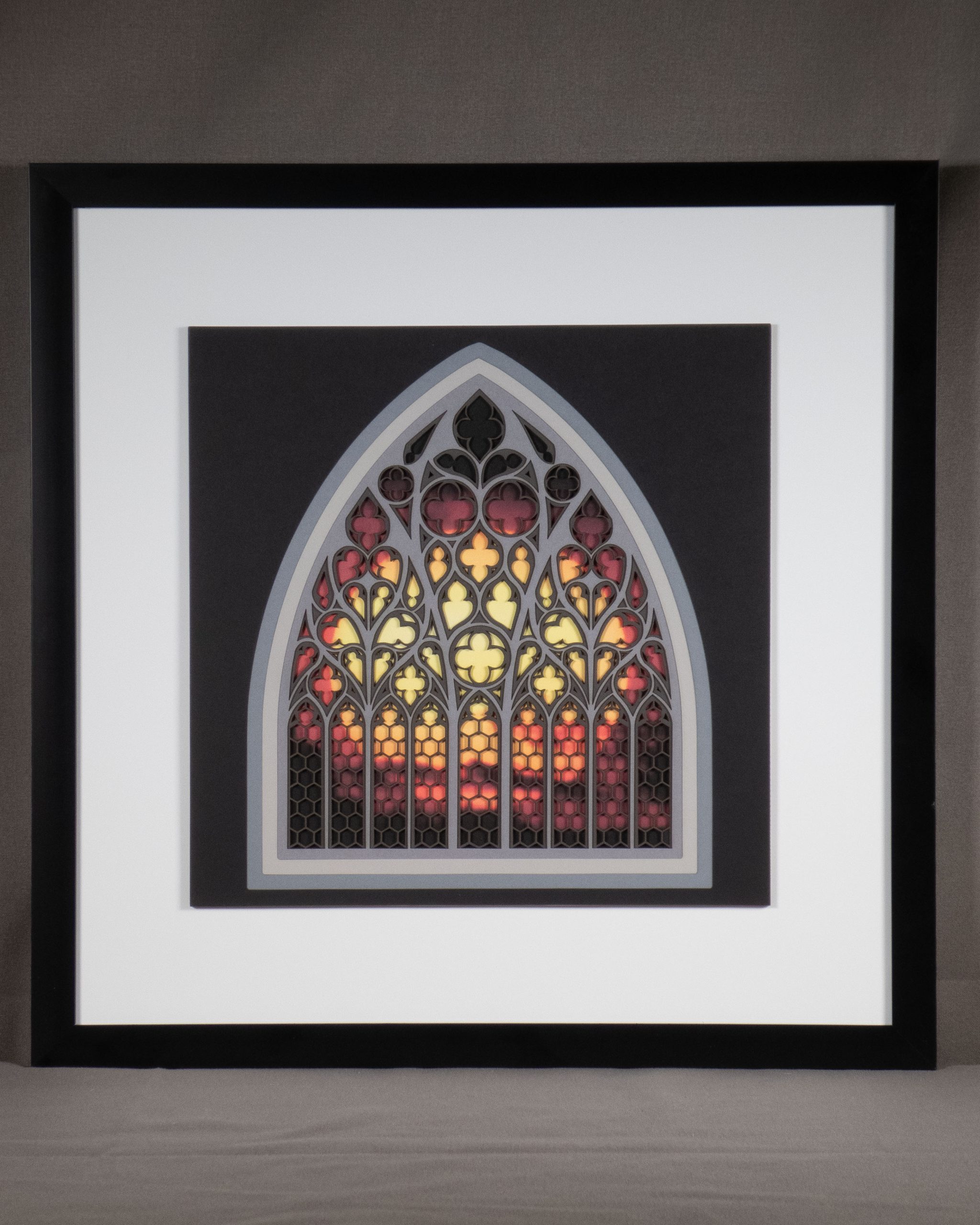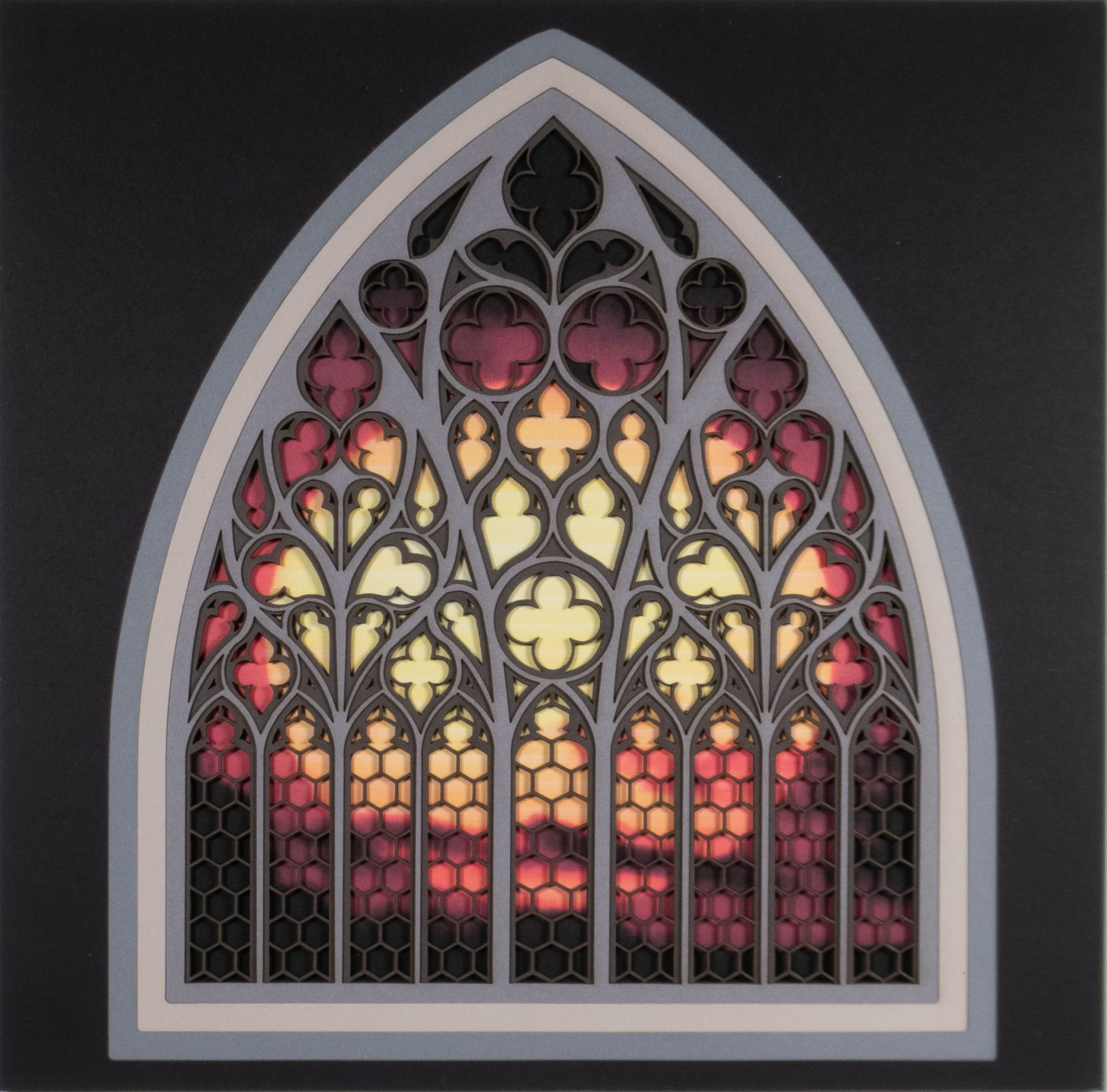 An eleven layer interpretation of a 14th century cathedral window, animated by the light of the setting sun that sustains life on Earth, emphasizing form, symmetry, and the quiet power of illumination.