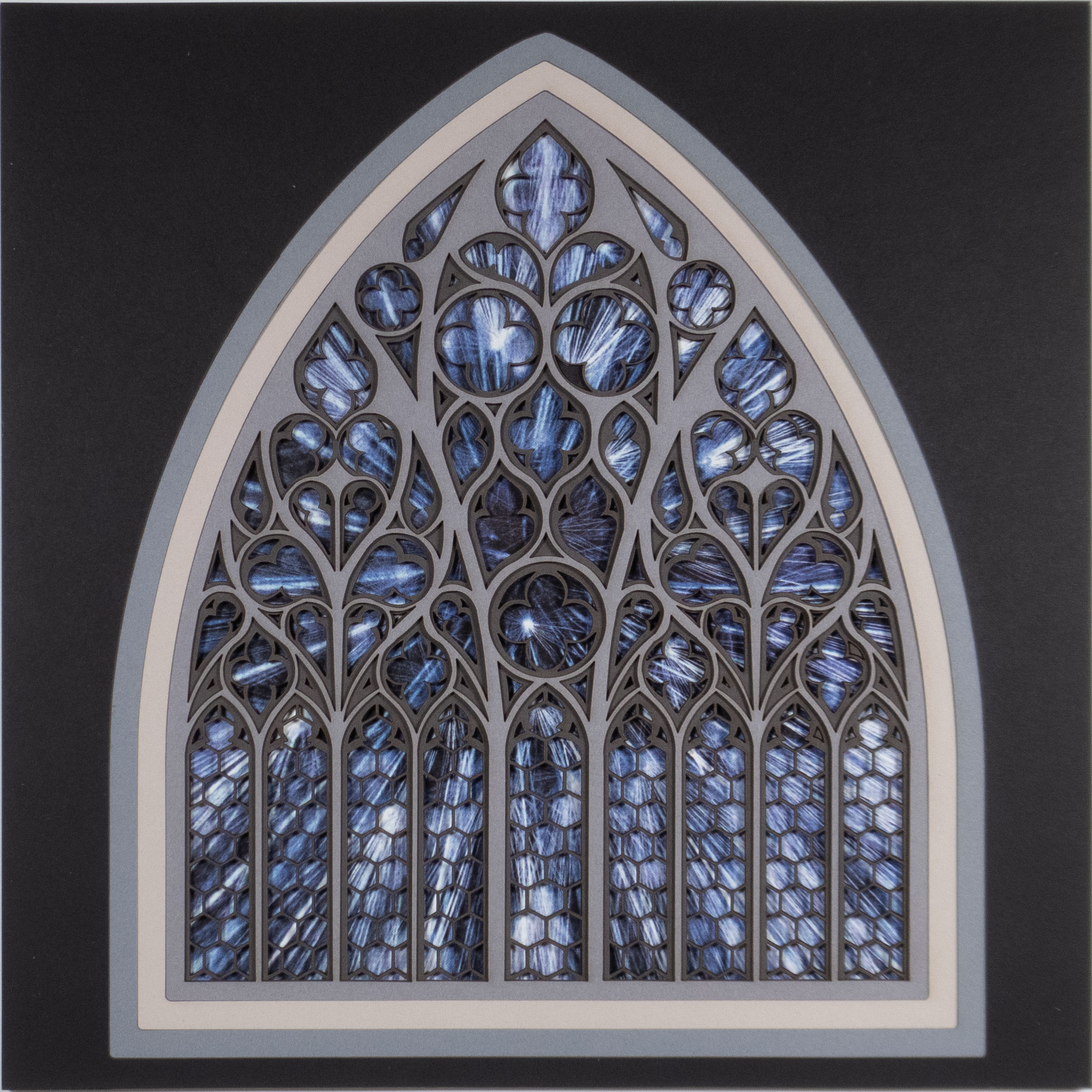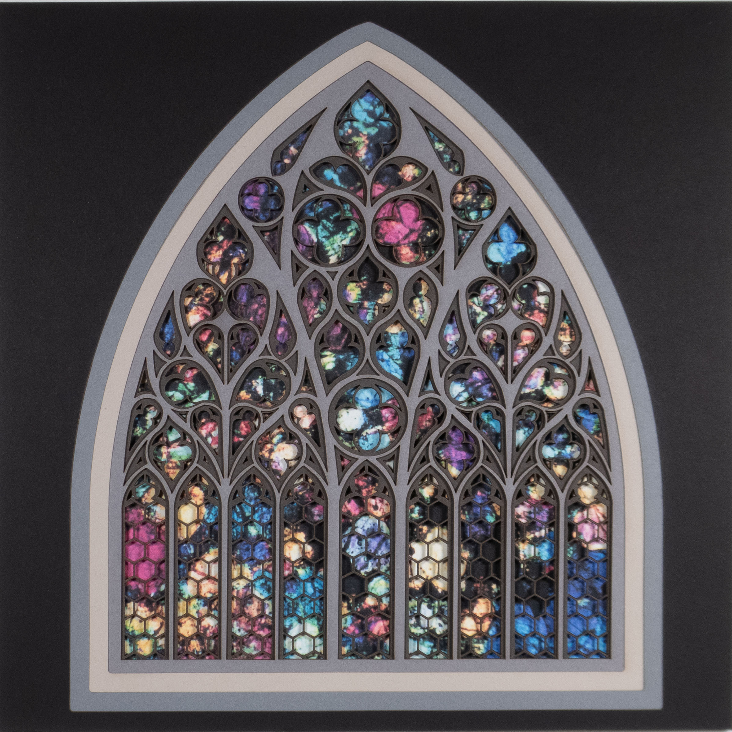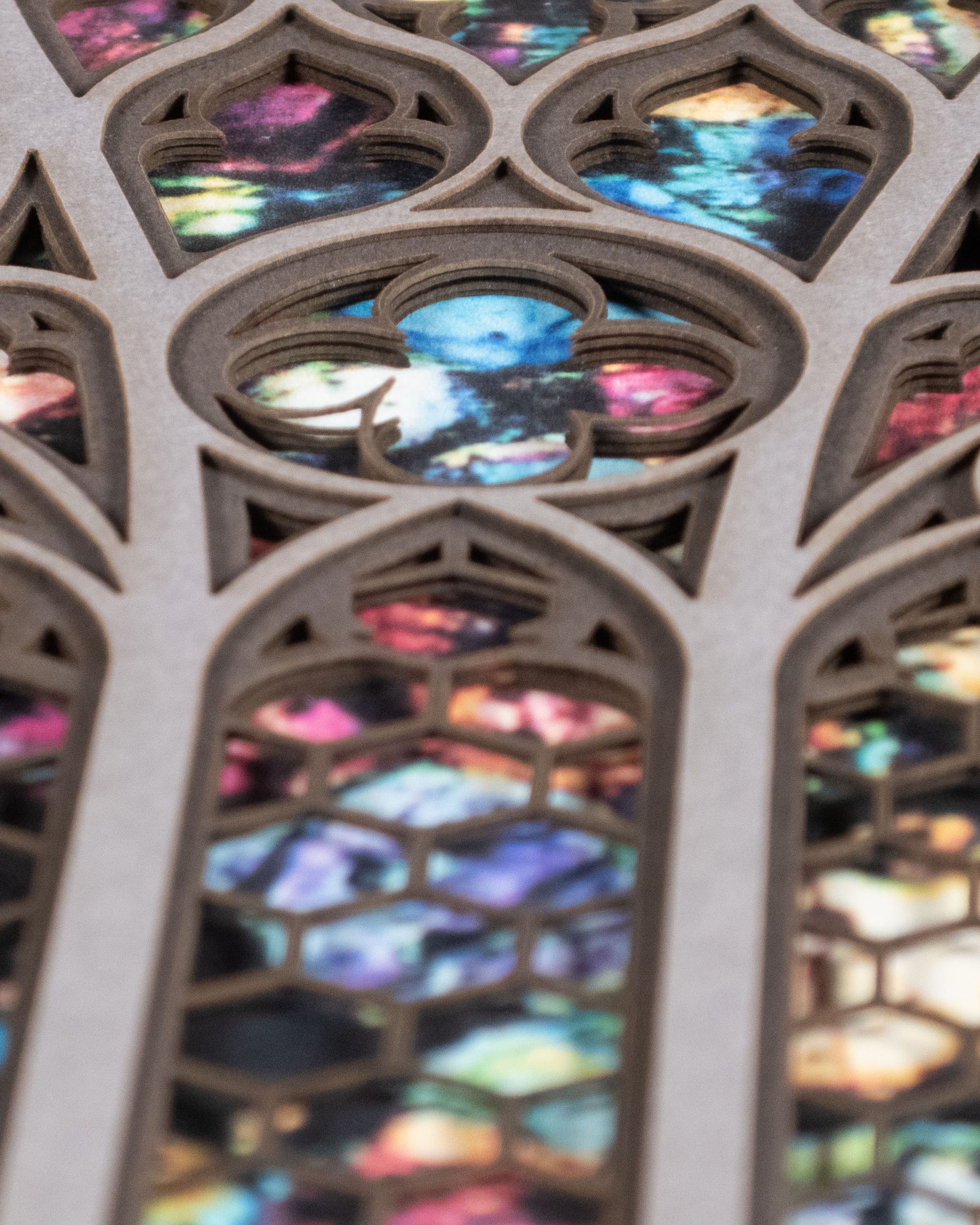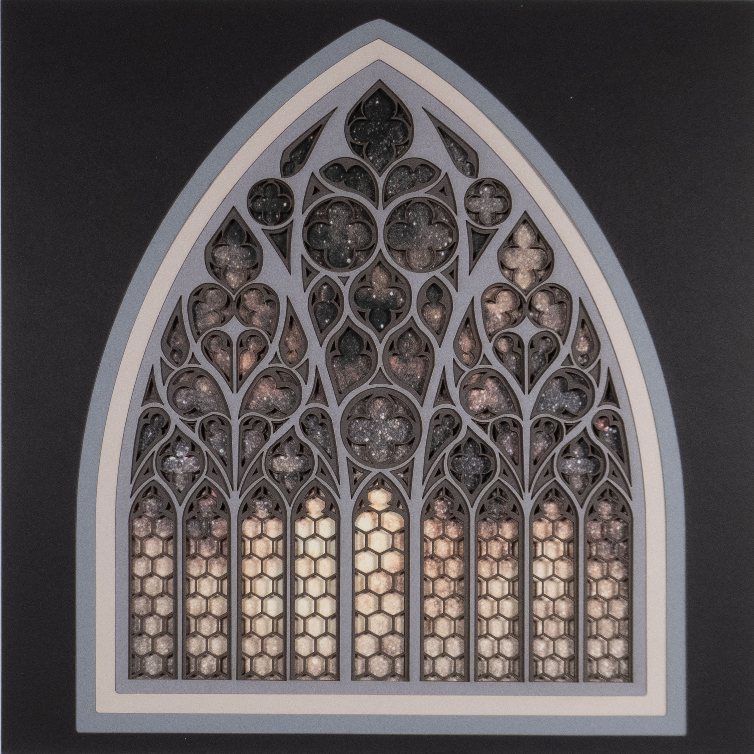 This series brings a single 14th-century cathedral window into dialogue with six very different subjects, using the same eleven-layer design as a constant architectural voice. By placing this medieval structure over images drawn from astronomy, geology, biology, and the natural world, each piece becomes a study in contrast—human order set against forces far older, larger, or more delicate than ourselves.