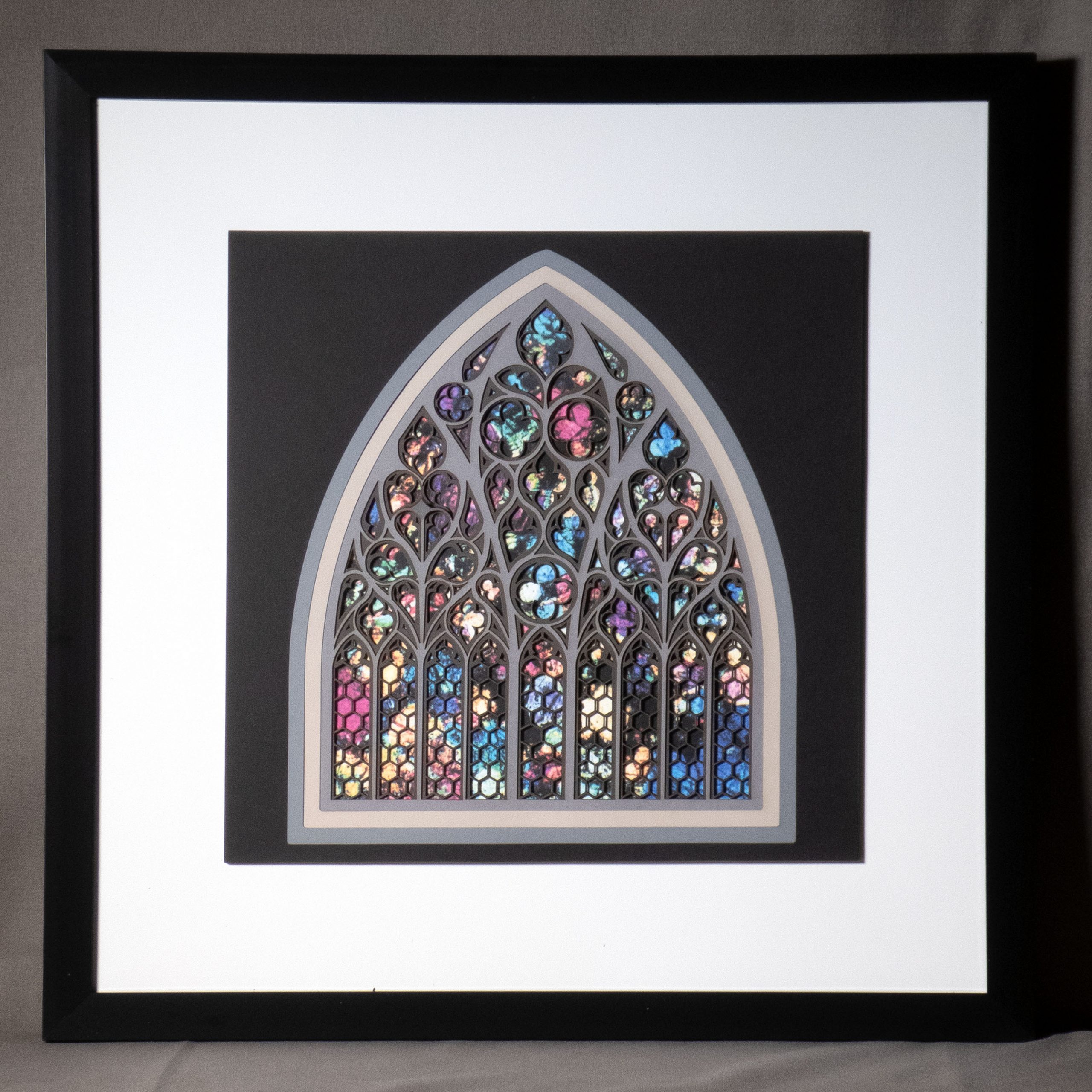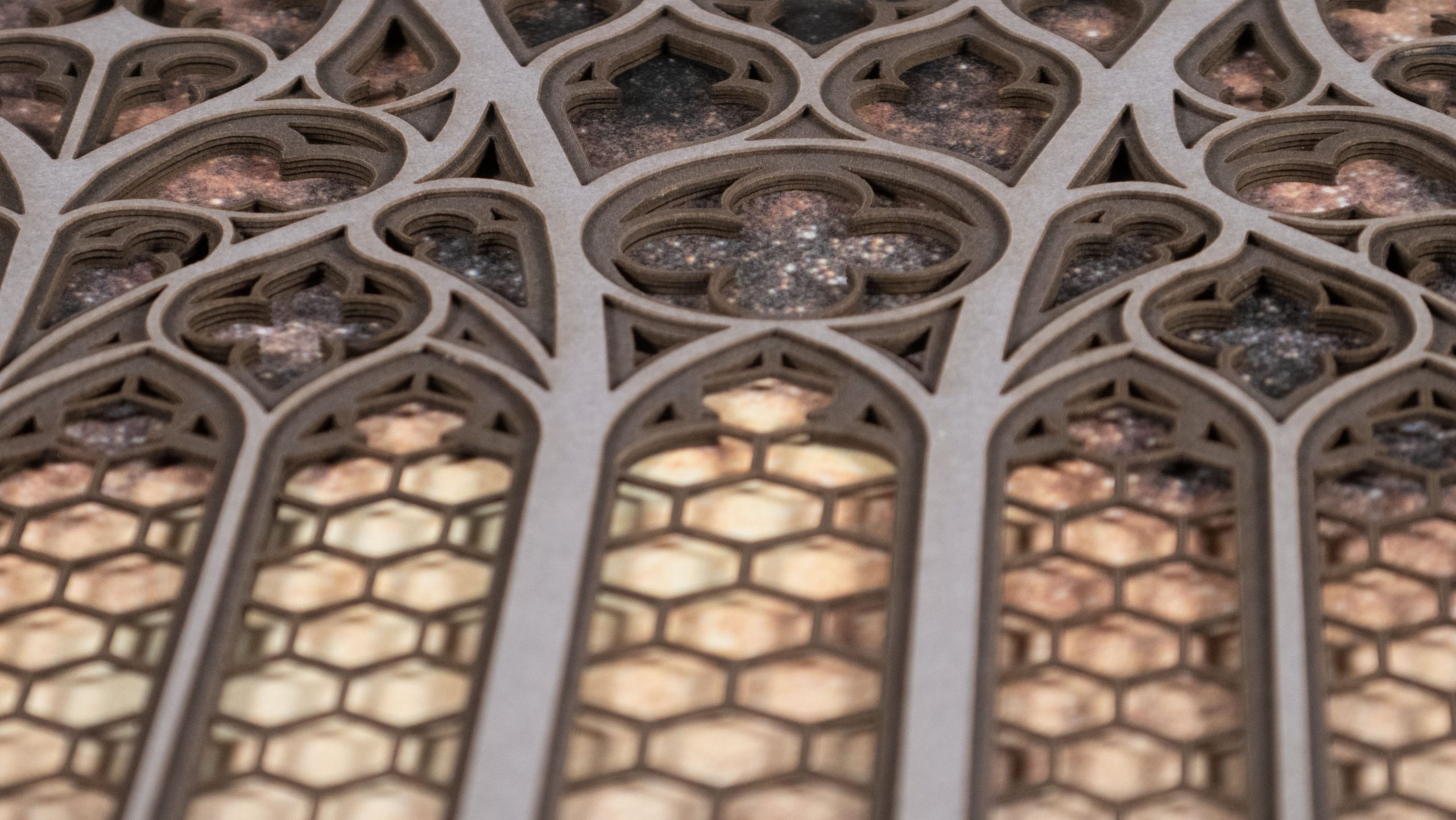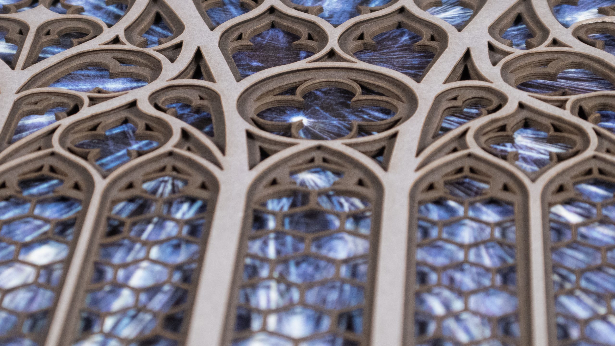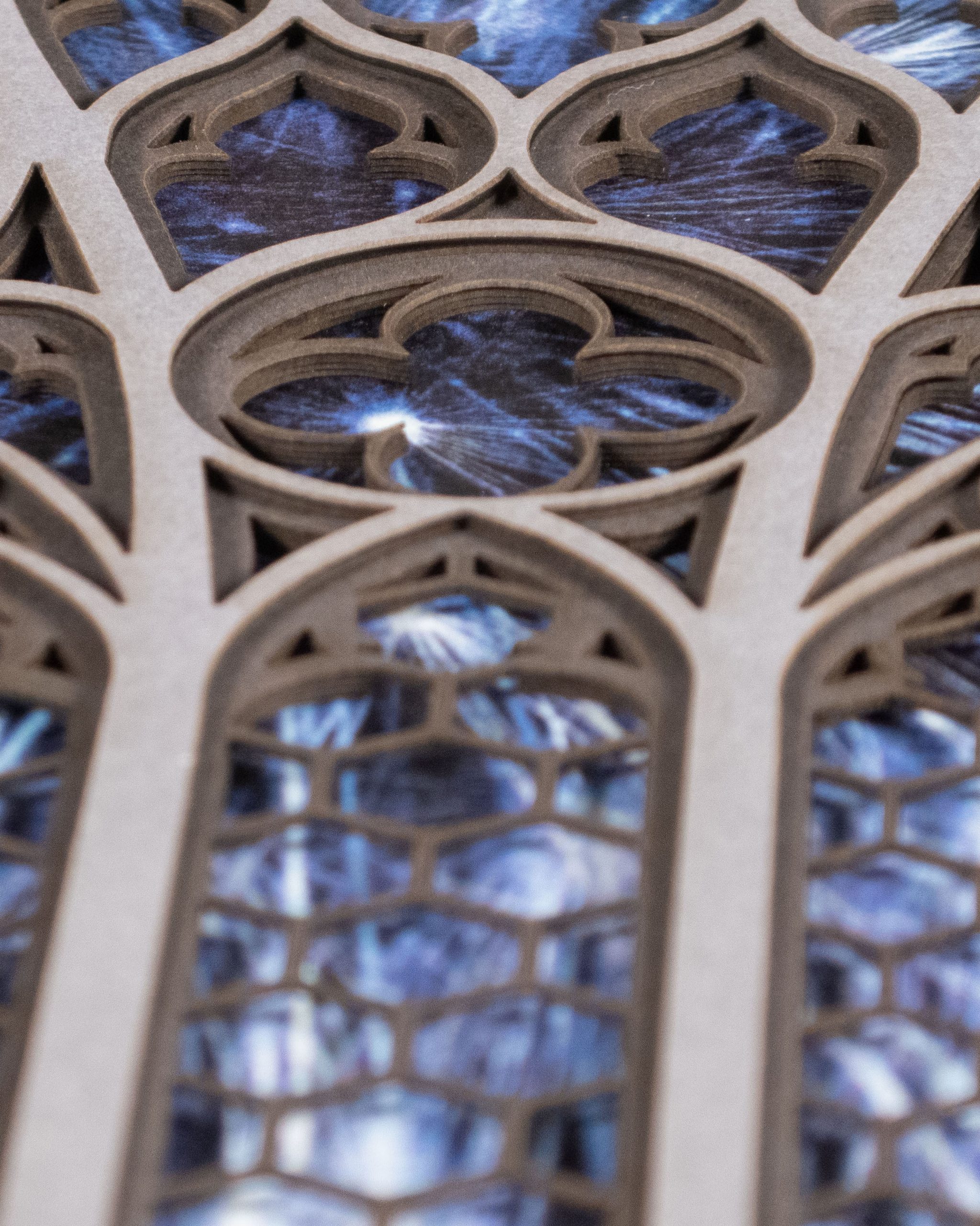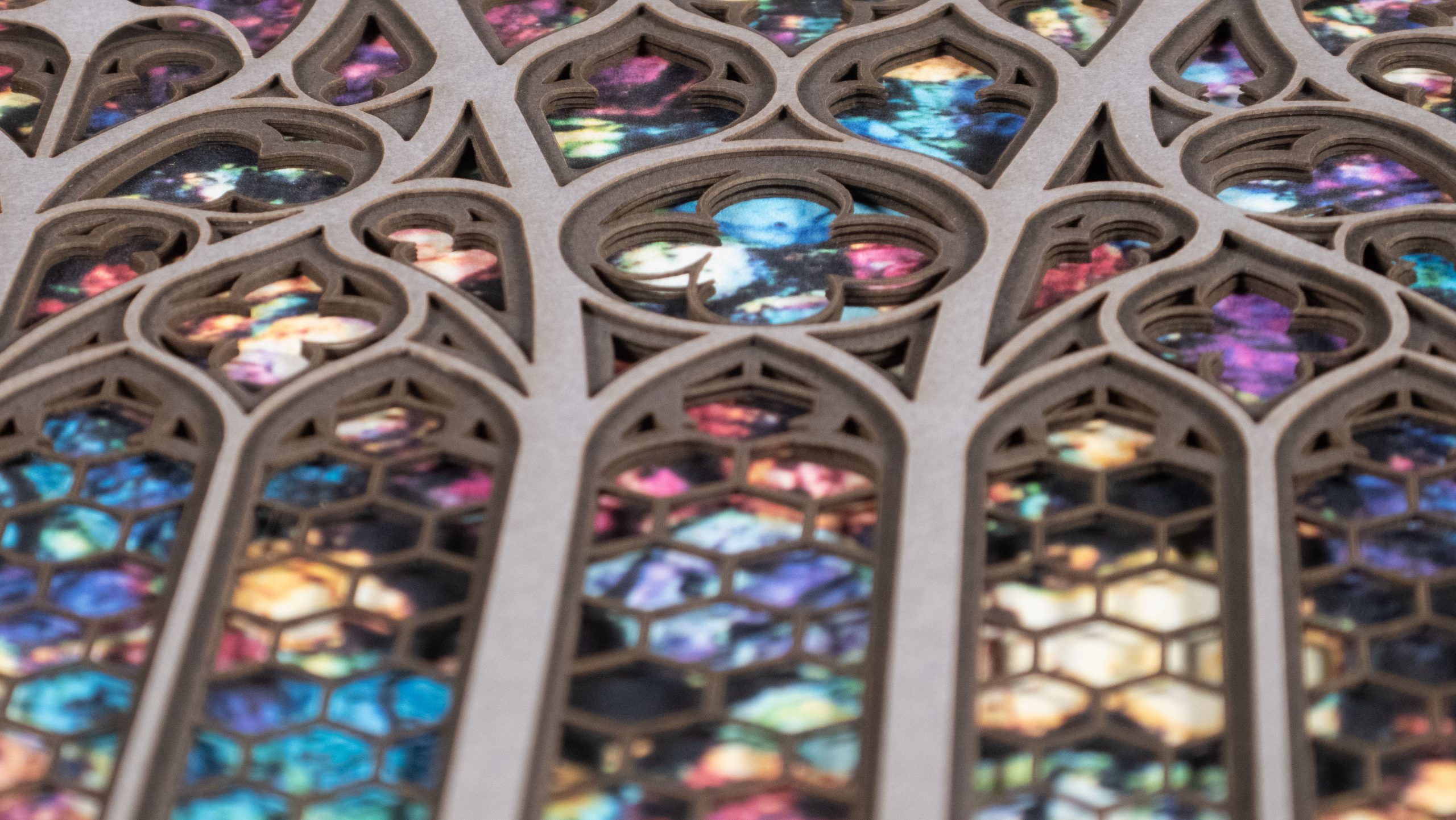 This series brings a single 14th-century cathedral window into dialogue with six very different subjects, using the same eleven-layer design as a constant architectural voice. By placing this medieval structure over images drawn from astronomy, geology, biology, and the natural world, each piece becomes a study in contrast—human order set against forces far older, larger, or more delicate than ourselves.