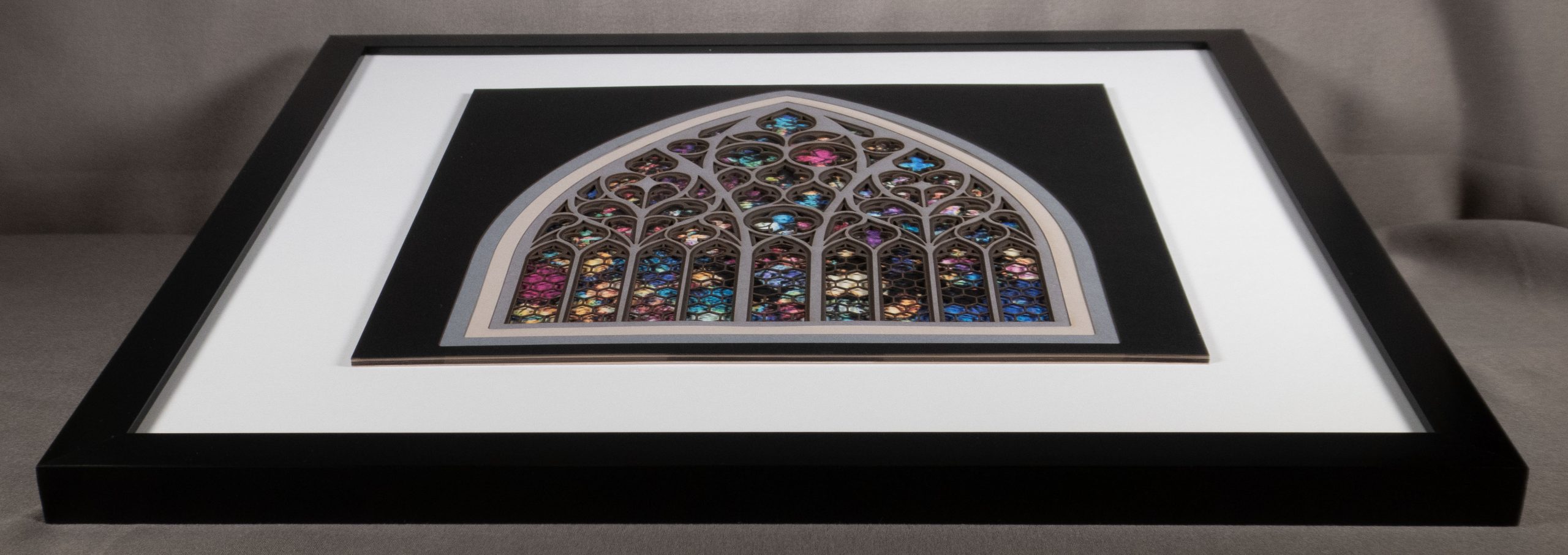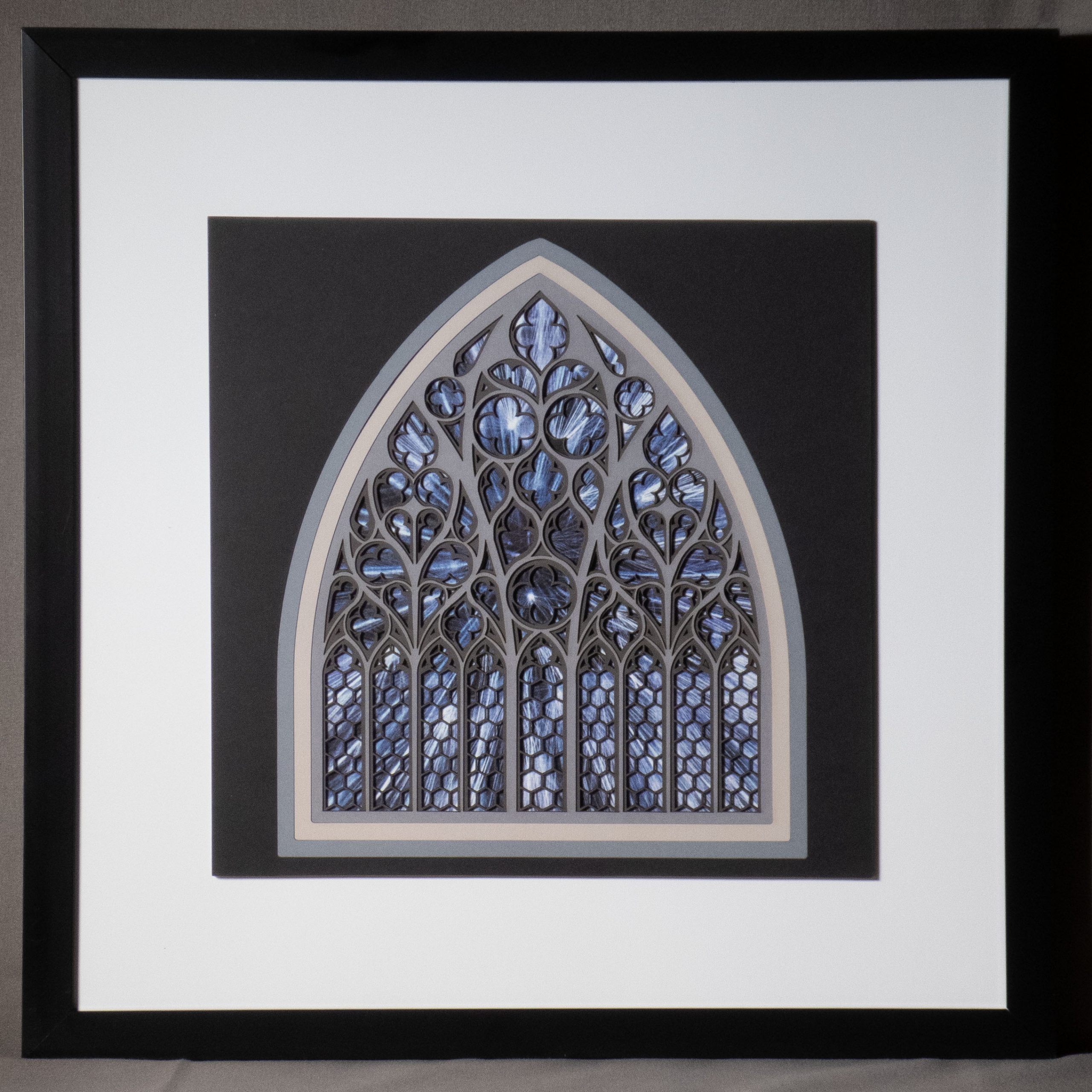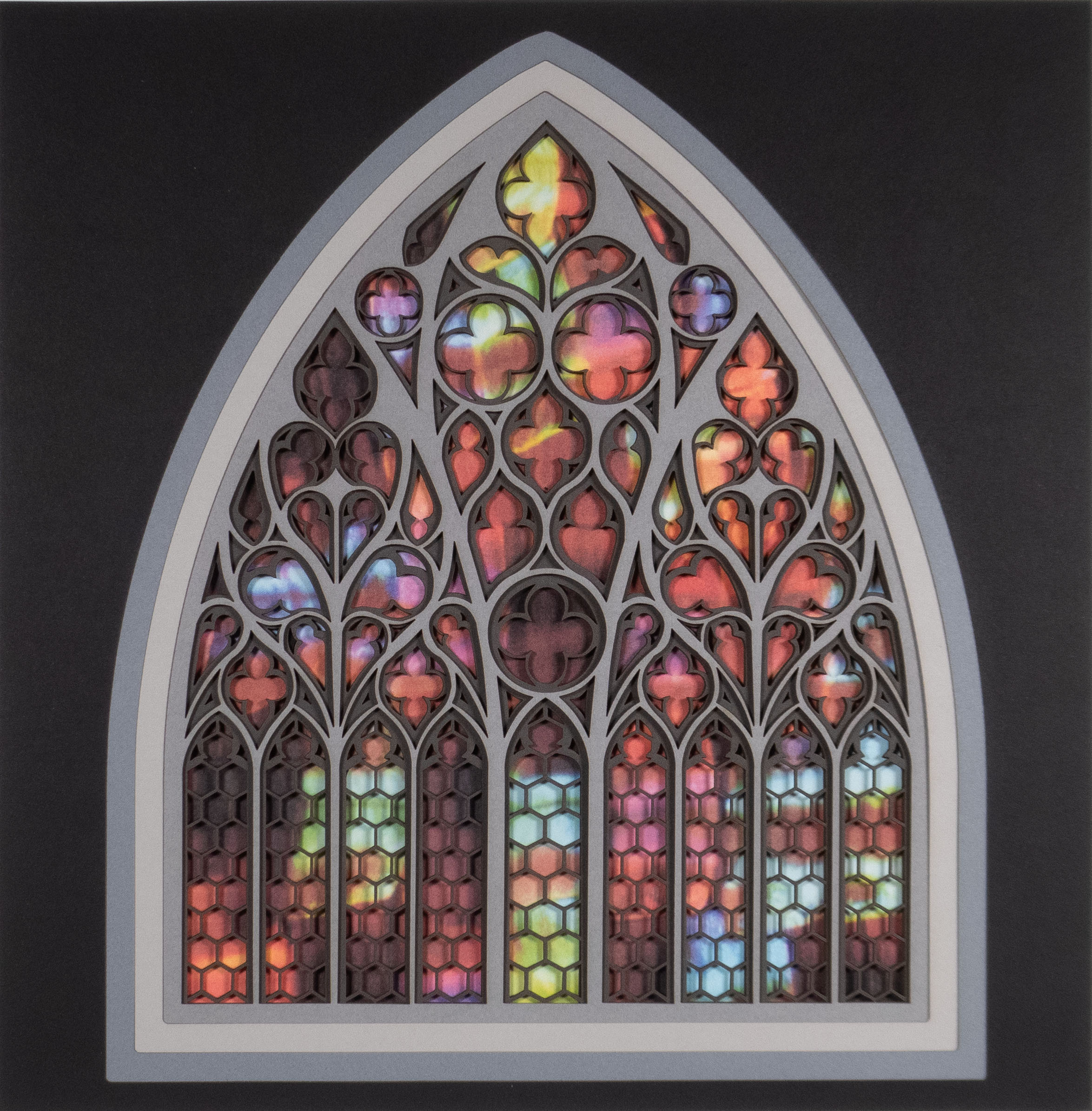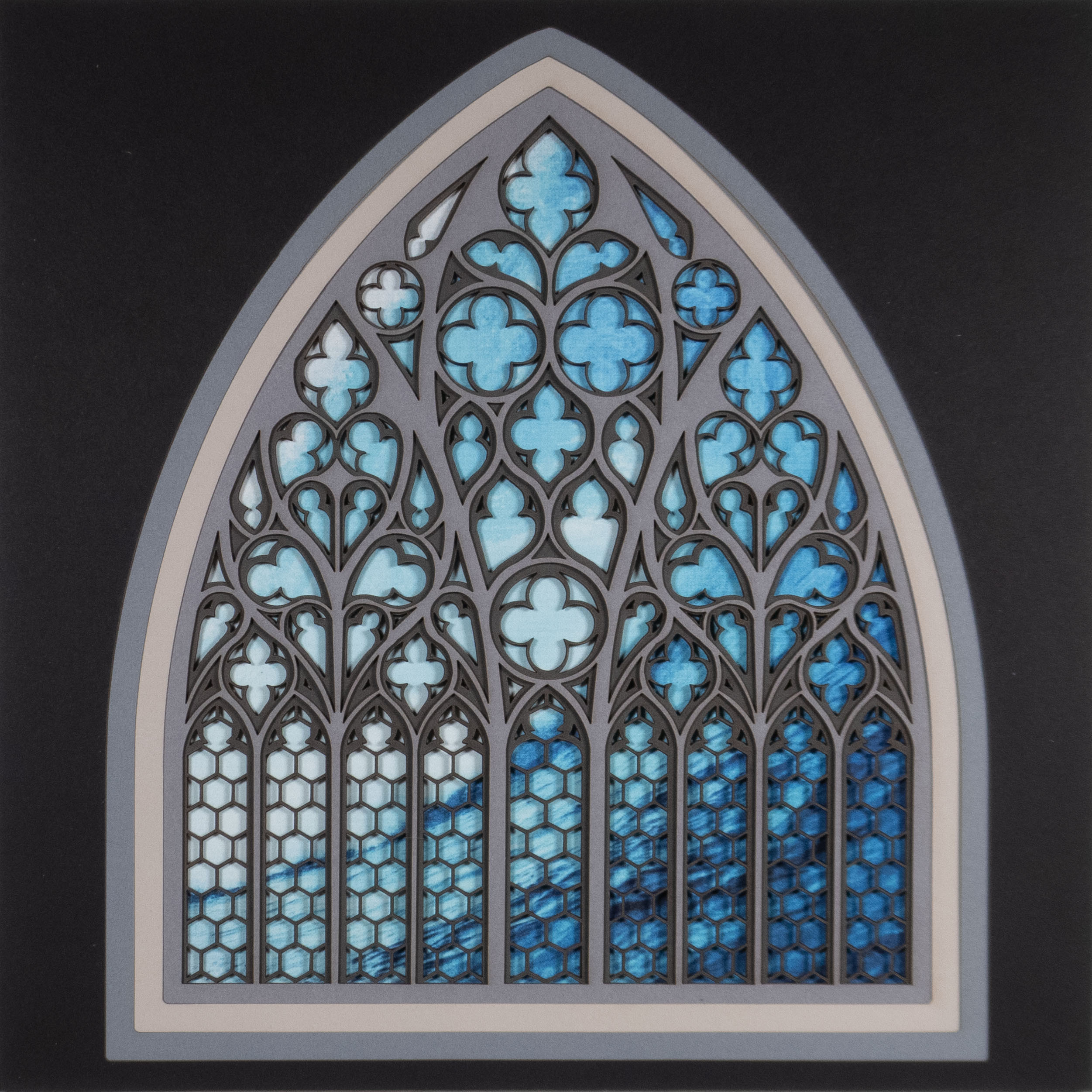 This series brings a single 14th-century cathedral window into dialogue with six very different subjects, using the same eleven-layer design as a constant architectural voice. By placing this medieval structure over images drawn from astronomy, geology, biology, and the natural world, each piece becomes a study in contrast—human order set against forces far older, larger, or more delicate than ourselves.
