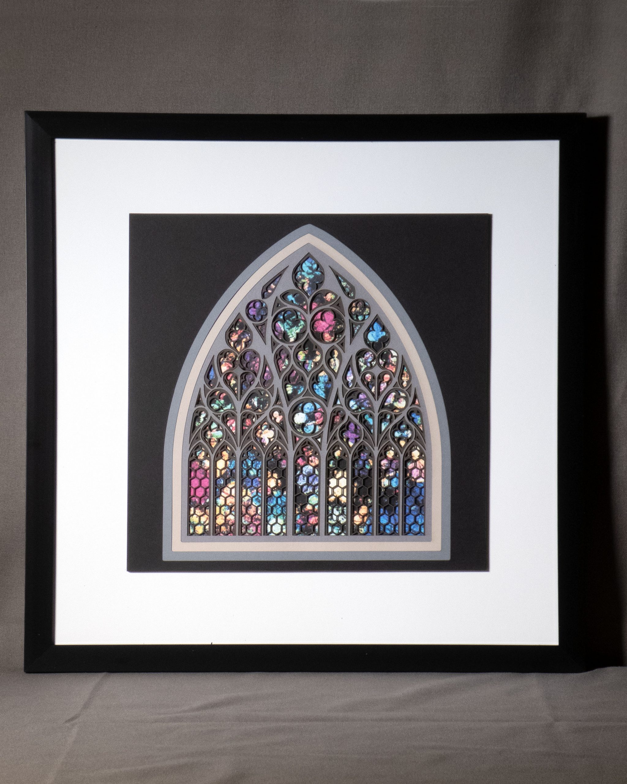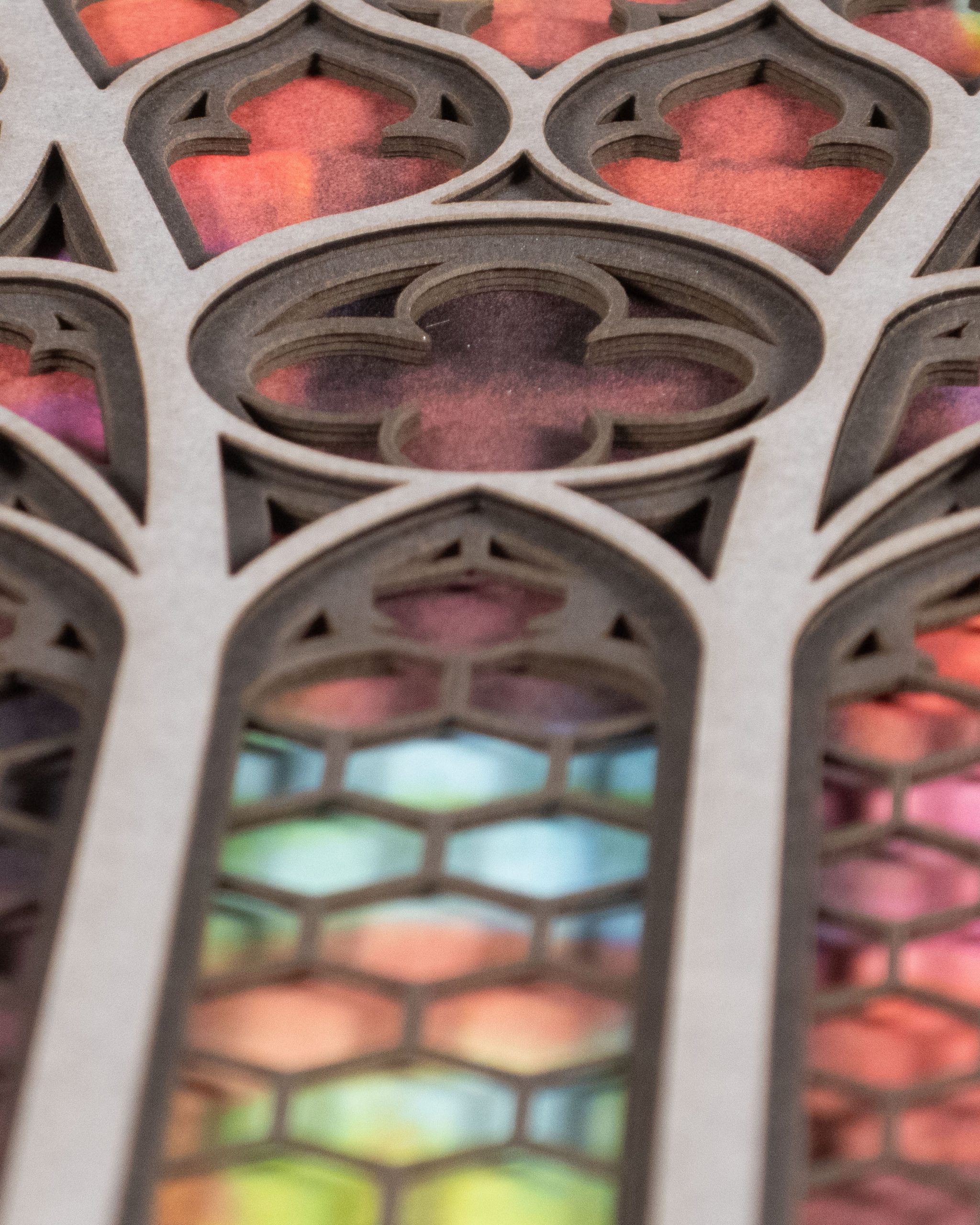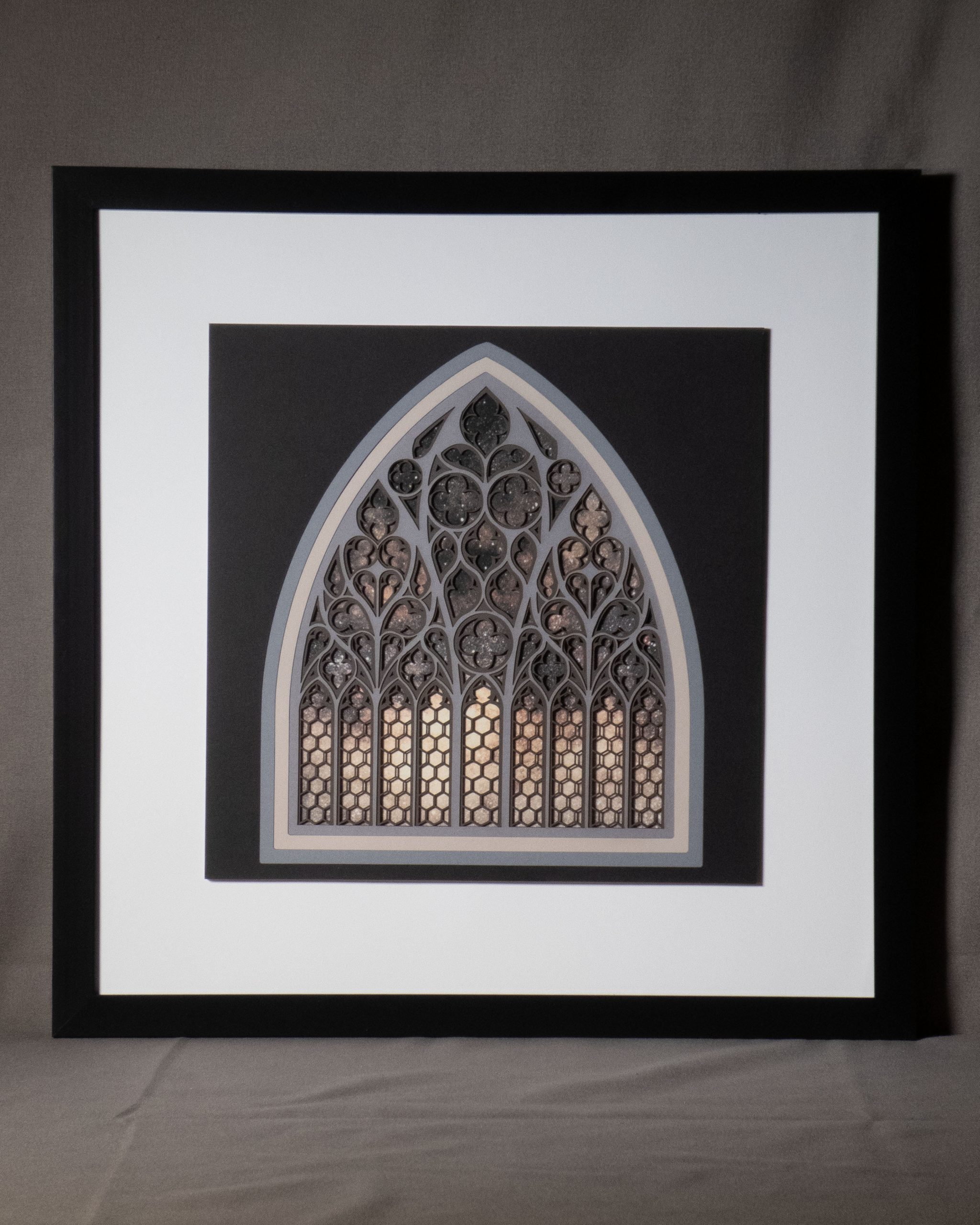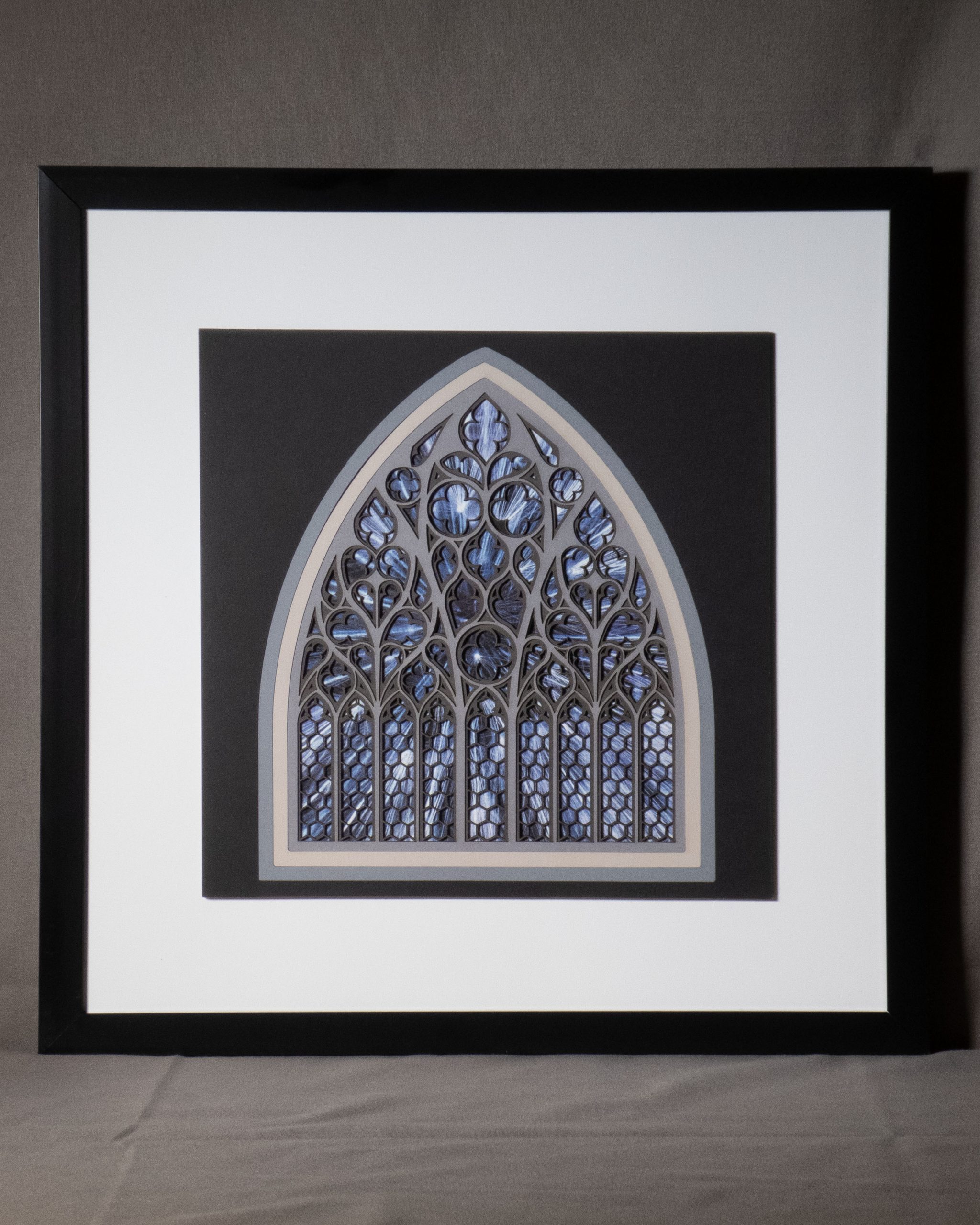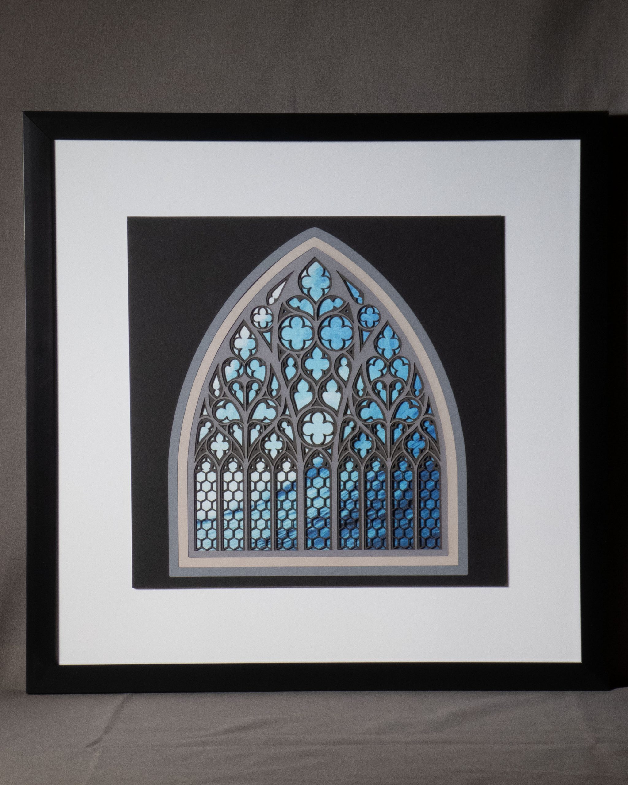 This series brings a single 14th-century cathedral window into dialogue with six very different subjects, using the same eleven-layer design as a constant architectural voice. By placing this medieval structure over images drawn from astronomy, geology, biology, and the natural world, each piece becomes a study in contrast—human order set against forces far older, larger, or more delicate than ourselves.