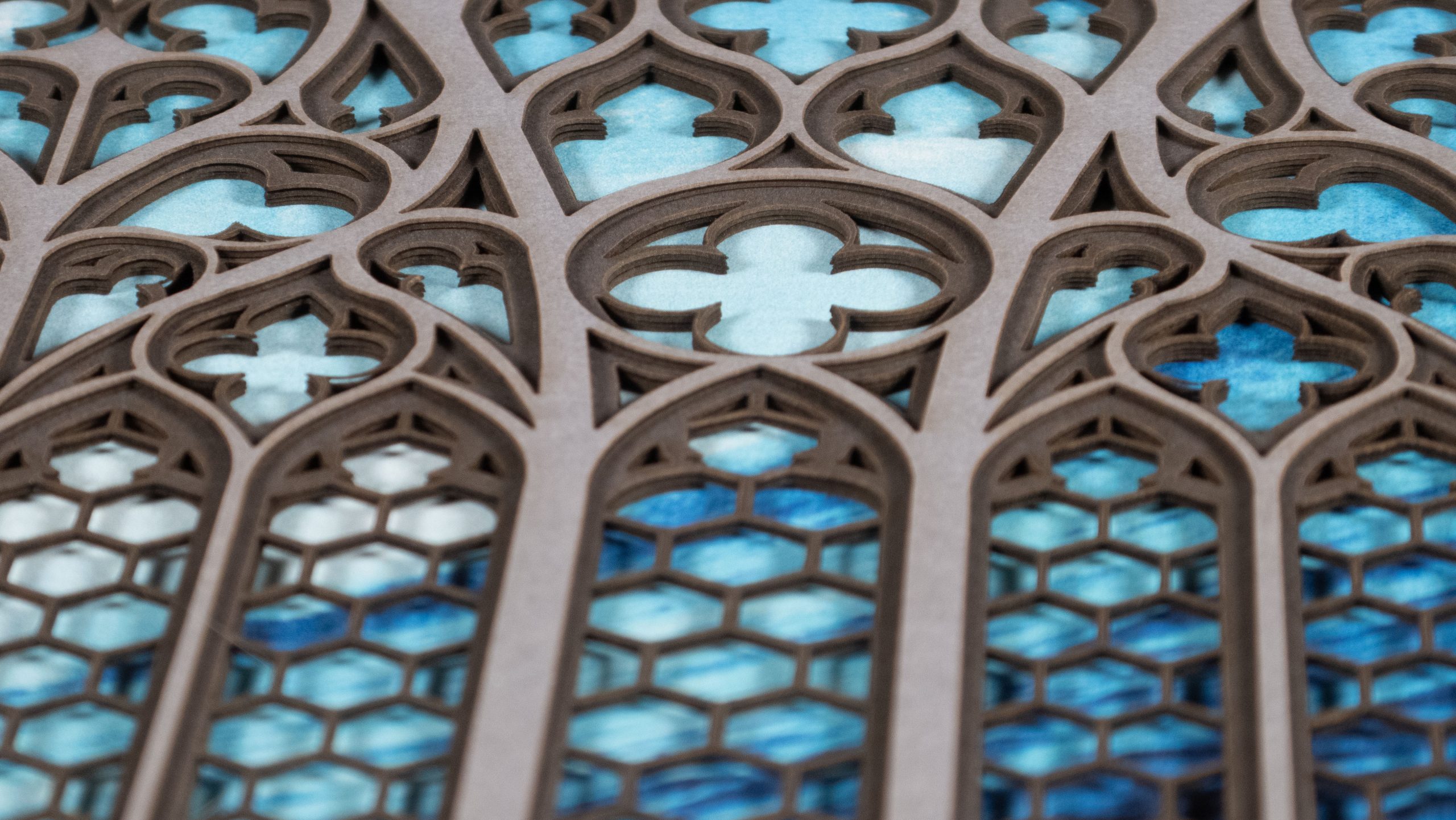 An eleven layer 14th‑century cathedral window over a cresting wave, reflecting life’s origins in the ocean and the steady, calming effect that watching the sea has on us.