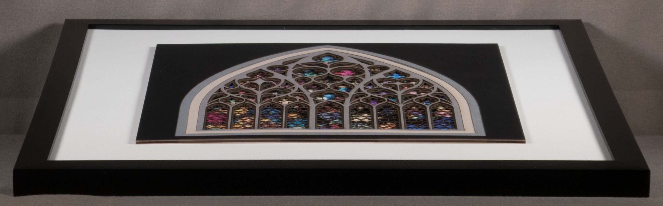 An eleven layer 14th century cathedral window over an 860X view of butterfly wing scales, revealing iridescent colors and the delicate structure that reflects the remarkable diversity found throughout nature.