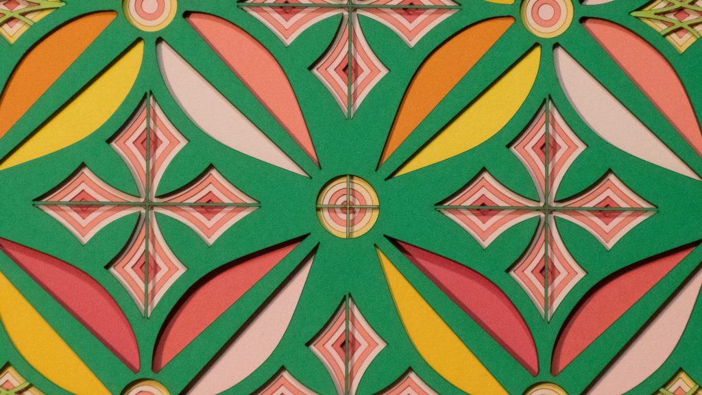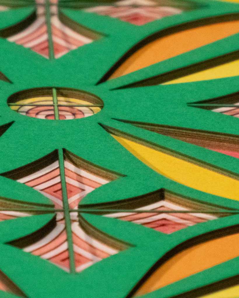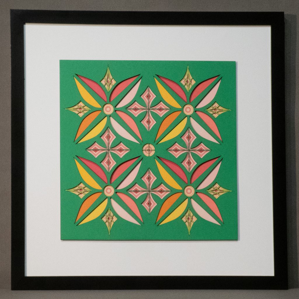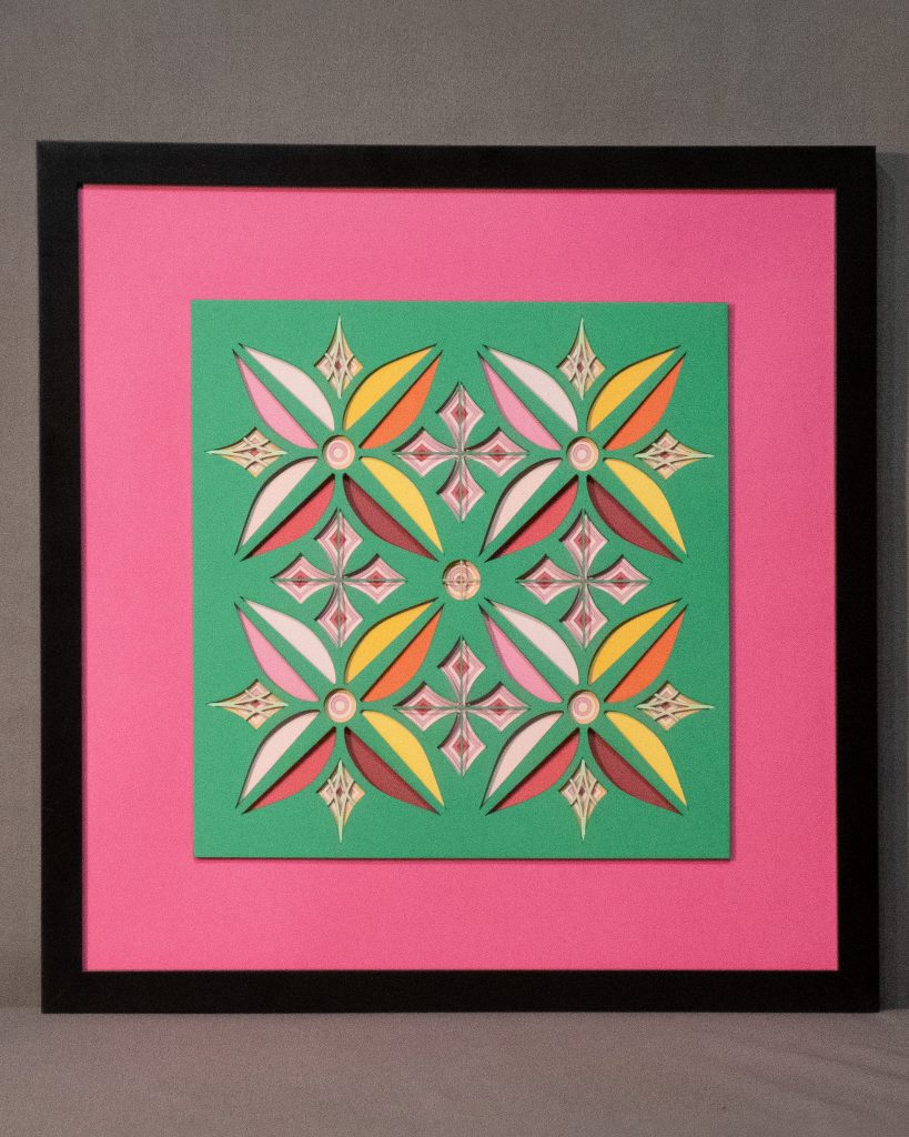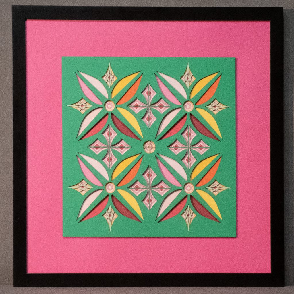 Flowers & Kites is a bold 13 layer geometric composition where six-petaled floral forms and diamond-shaped kite motifs alternate in a vibrant, symmetrical dance.