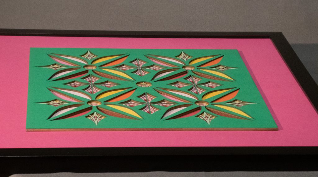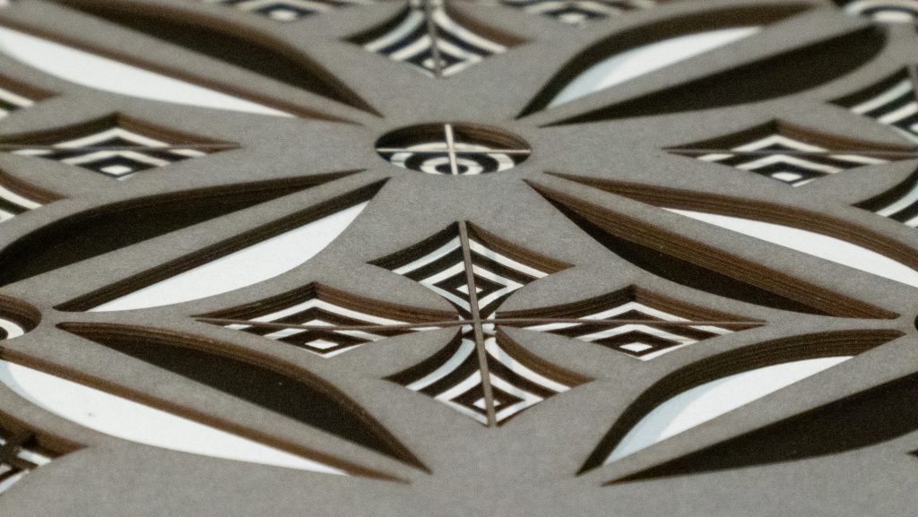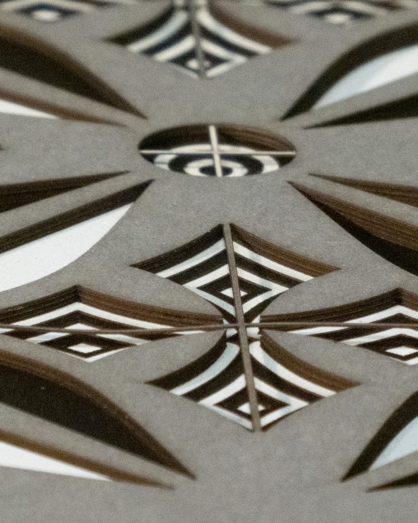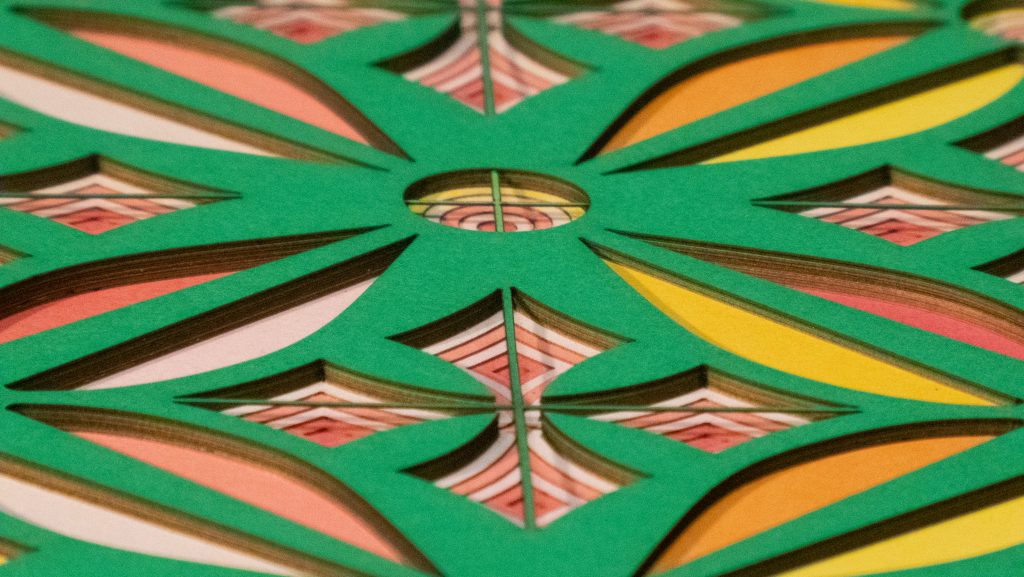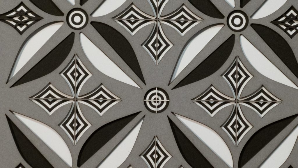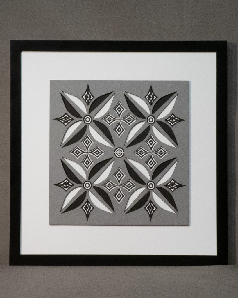 Flowers & Kites is a bold 13 layer geometric composition where six-petaled floral forms and diamond-shaped kite motifs alternate in a vibrant, symmetrical dance.