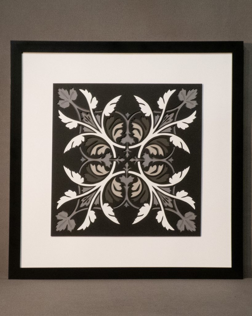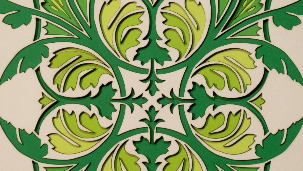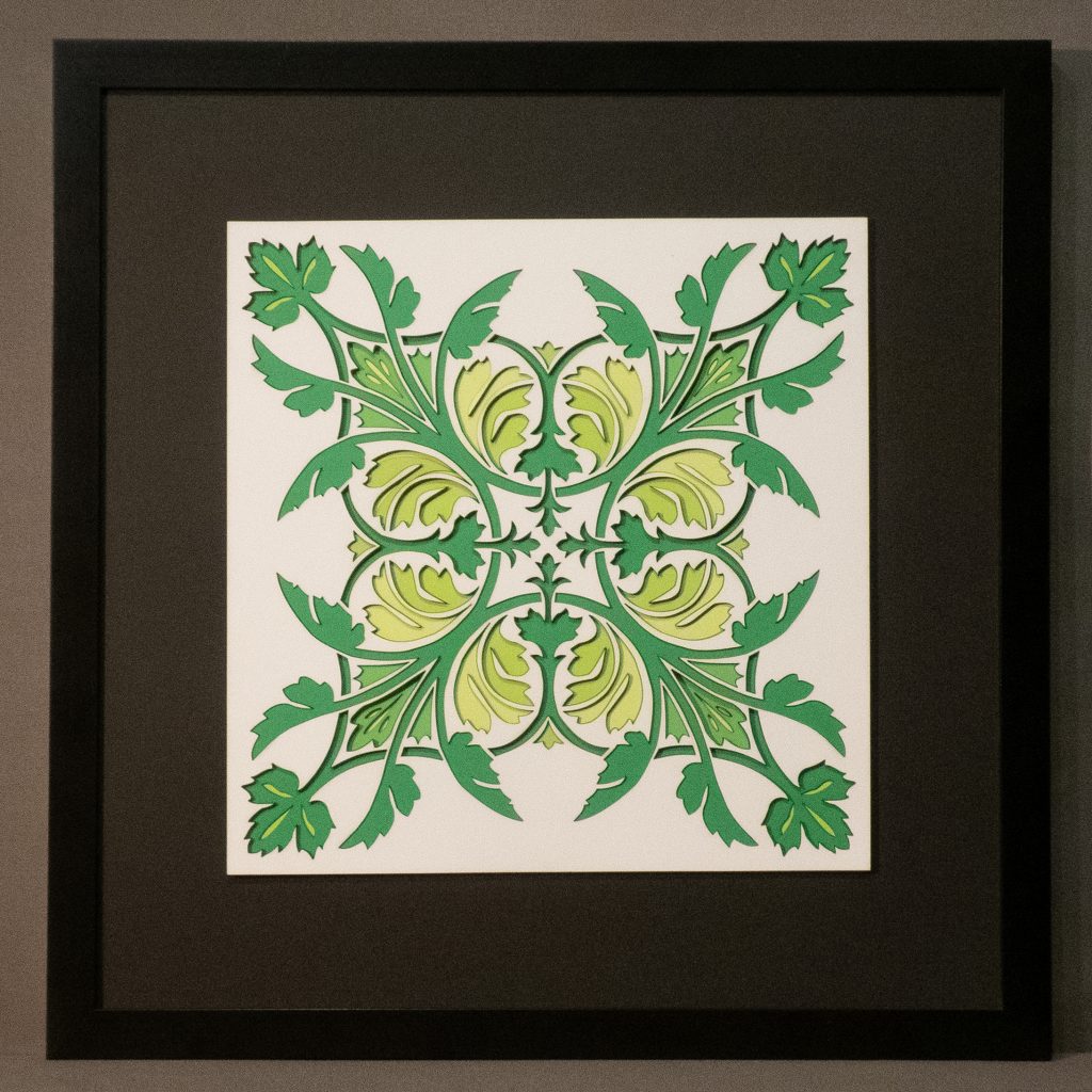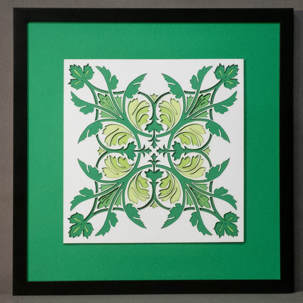 Leaves unfurl in perfect symmetry, forming a set of diagonal medallions that blends classical ornamentation with botanical elegance. Rendered in rich greens with 11 layers of detail, this design evokes timeless refinement.