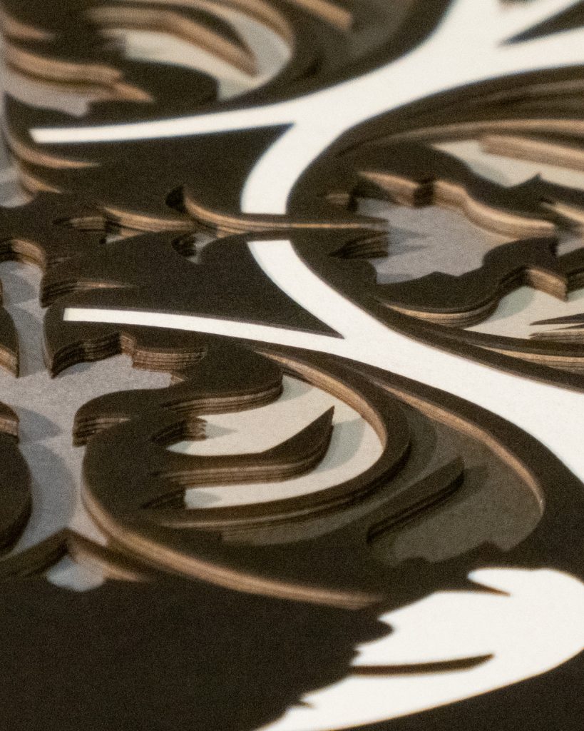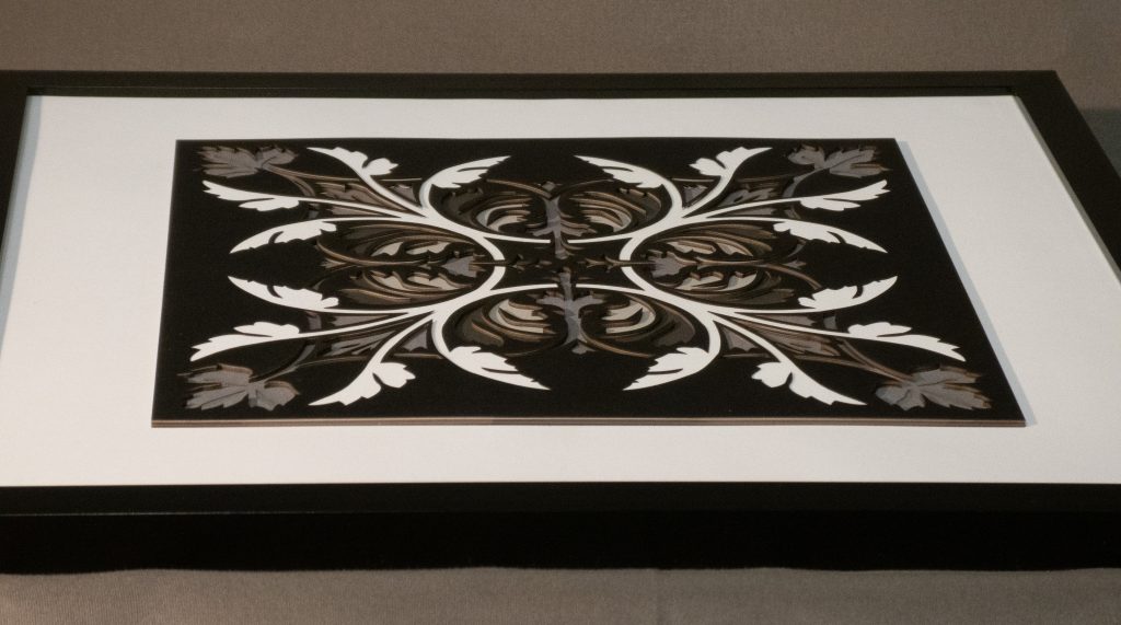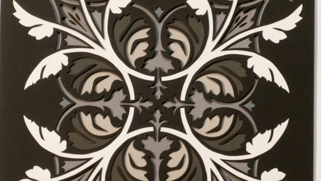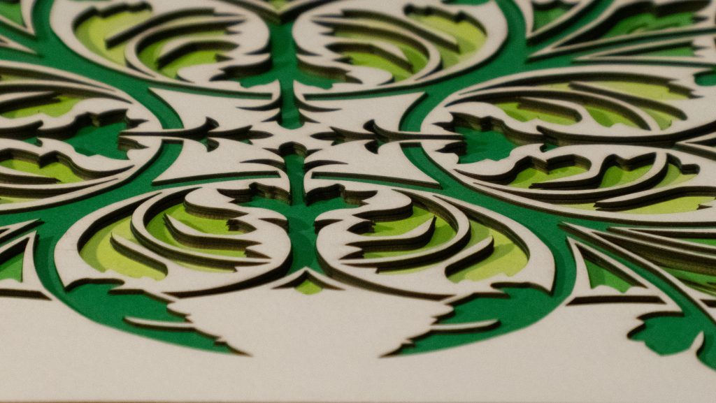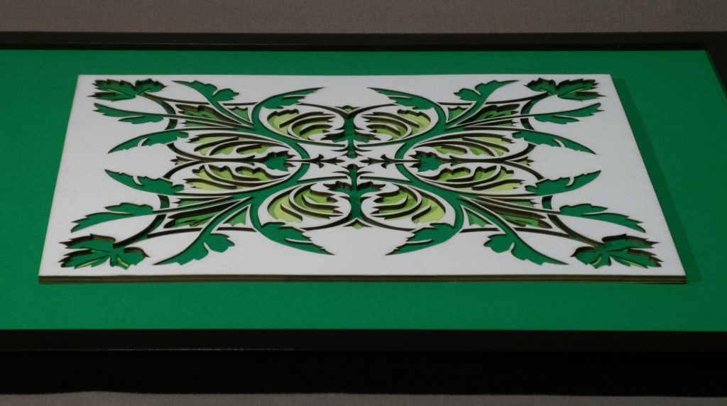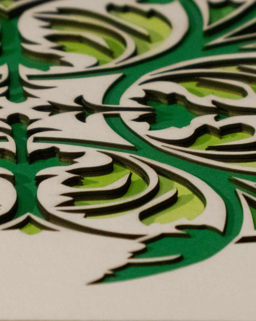 Leaves unfurl in perfect symmetry, forming a set of diagonal medallions that blends classical ornamentation with botanical elegance. Rendered in rich greens with 11 layers of detail, this design evokes timeless refinement.