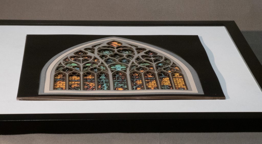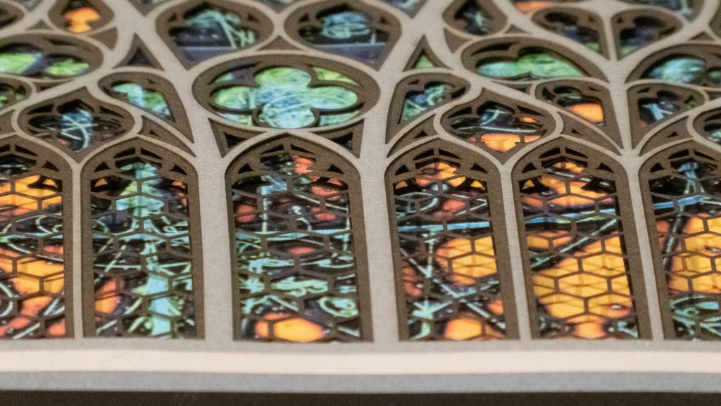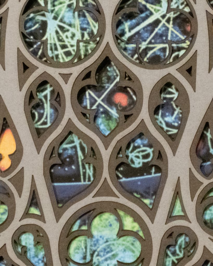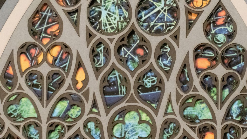 A Gothic window reimagined in 9 layers – Quantum Cathedral blends 14th-century cathedral design with imagery from CERN’s particle accelerator. Sacred symmetry meets atomic energy, creating an intersection of science, religion, and art.