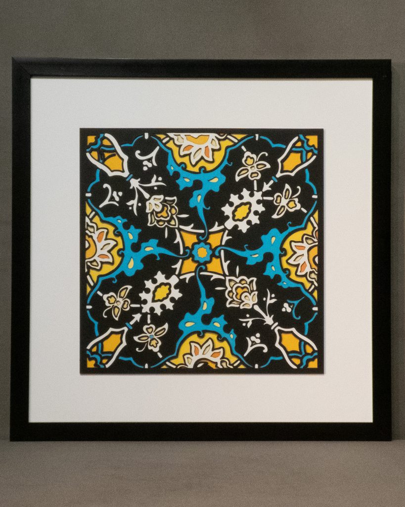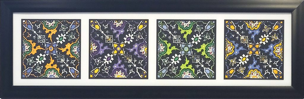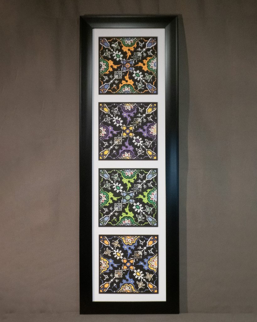 Also available as the Tekiya of the Dervishes Quad, below, where four individual works are presented together in a single frame. A shared palette in the outer floral details ties the pieces together, creating a beautifully unified composition. This piece can be hung horizontally or vertically.