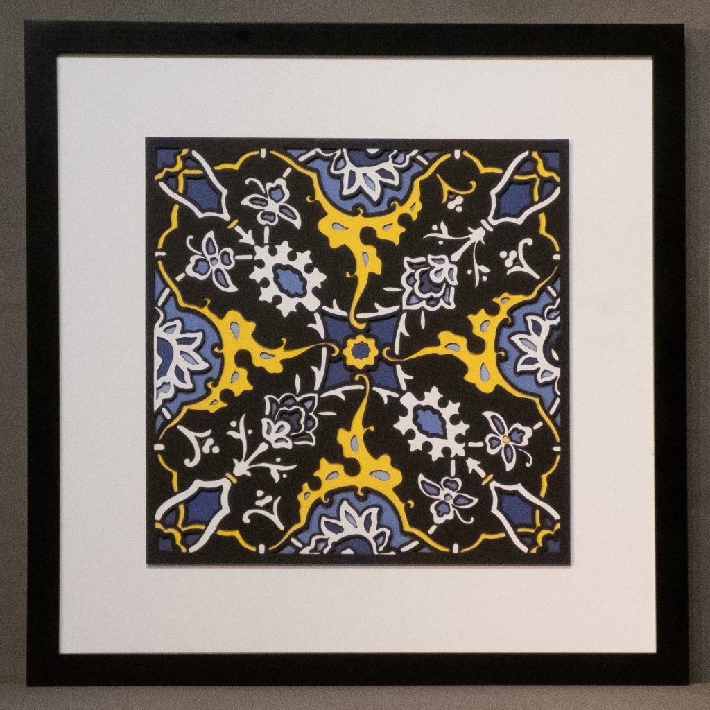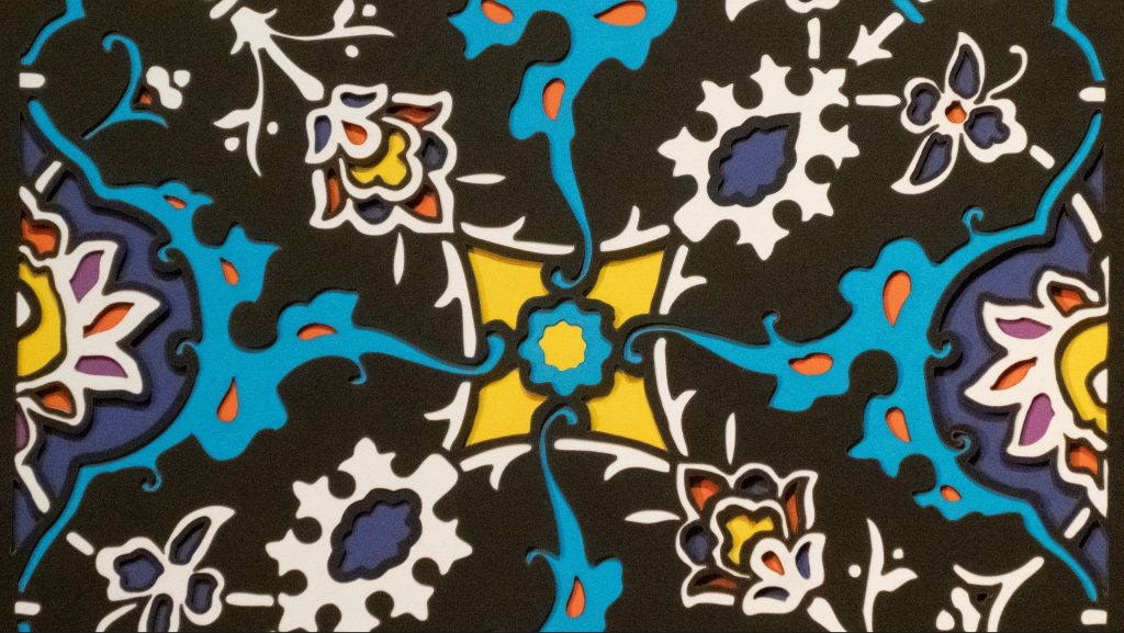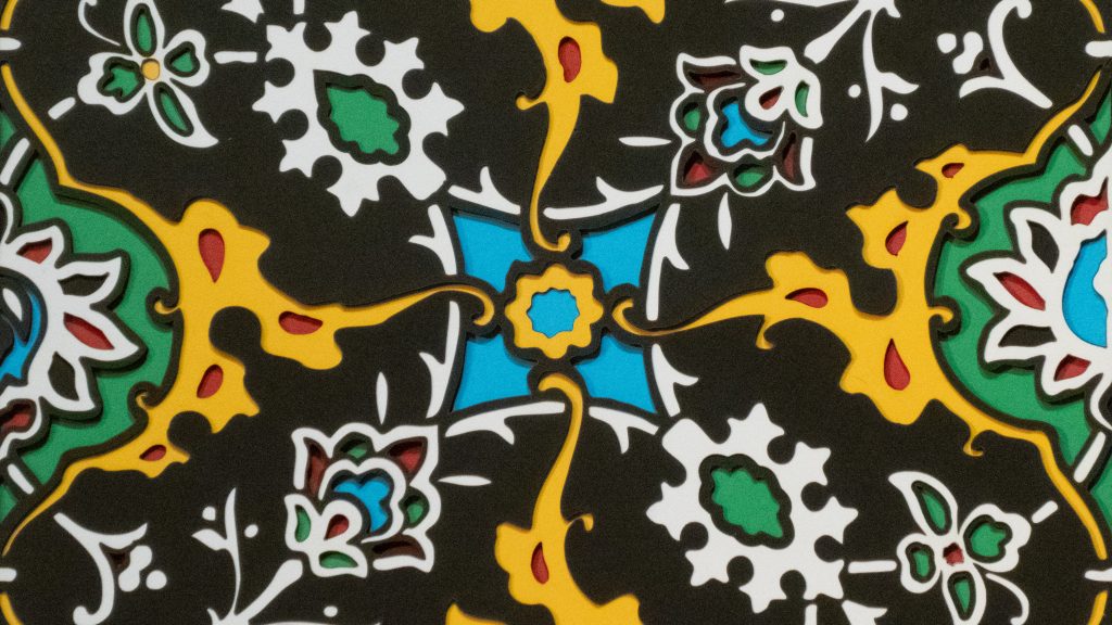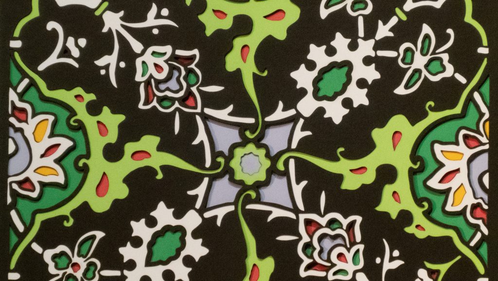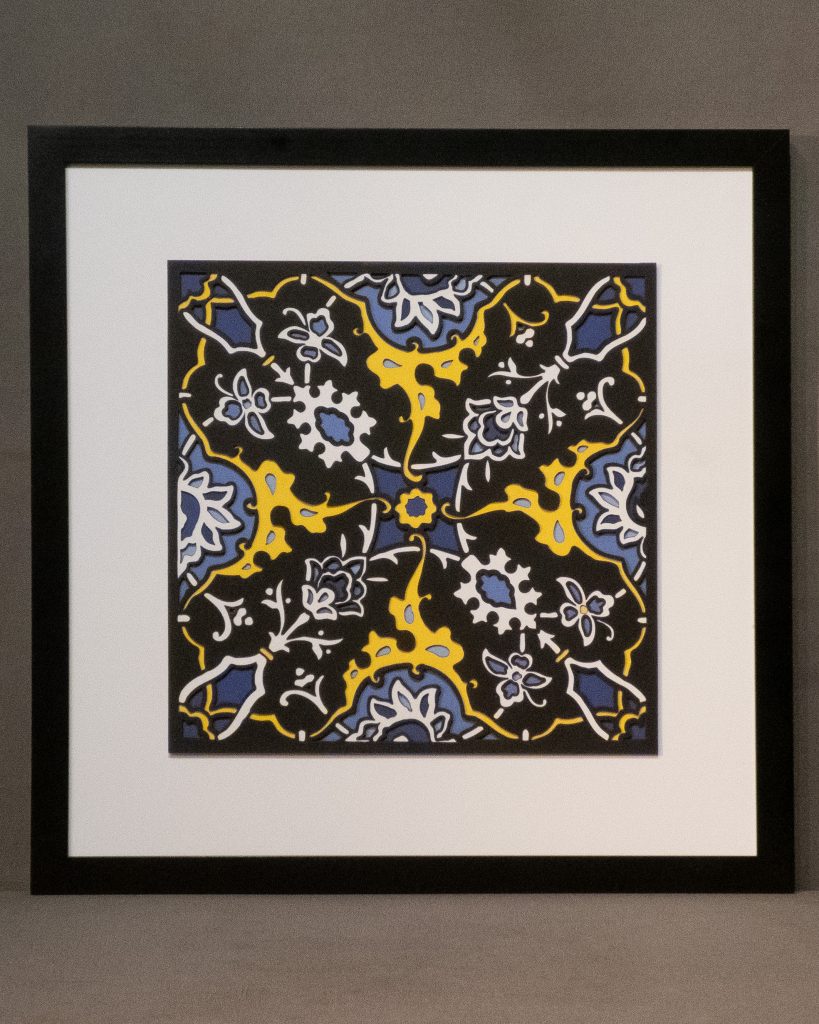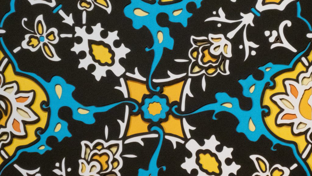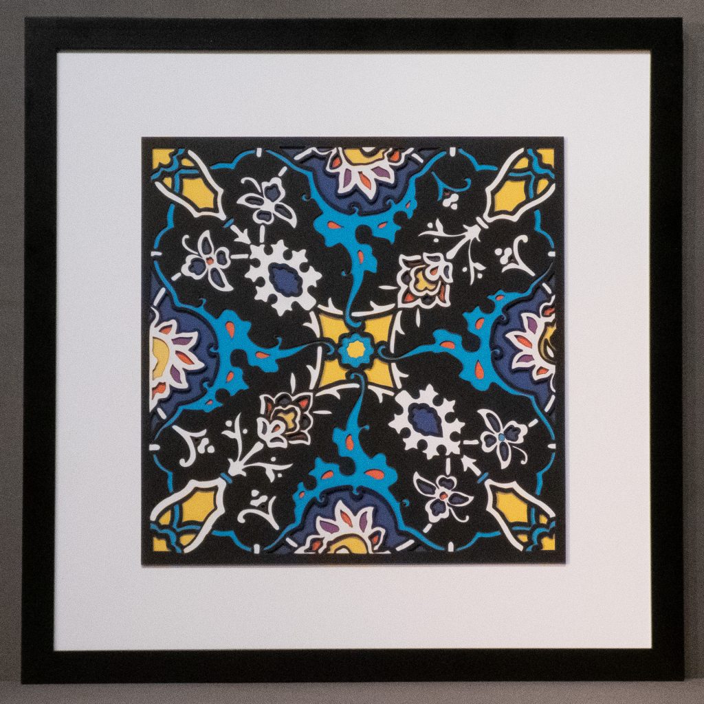 Inspired by a 17th century tile from the Egyptian mosque frequented by the Sufi order of the Whirling Dervishes who spun in repetitive circles to reach a ecstatic trance, this design unfolds across 8 layered sheets of paper.