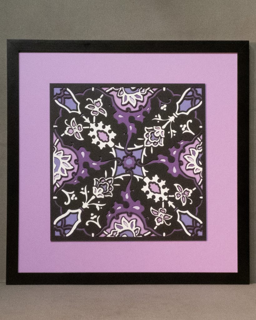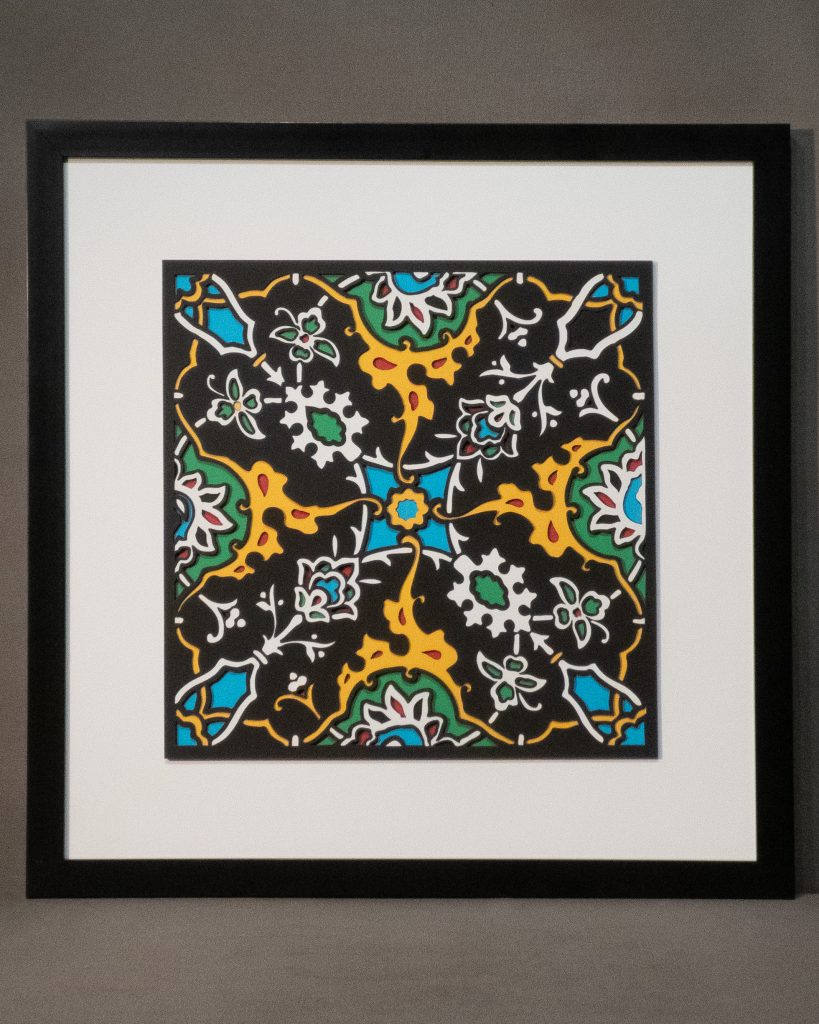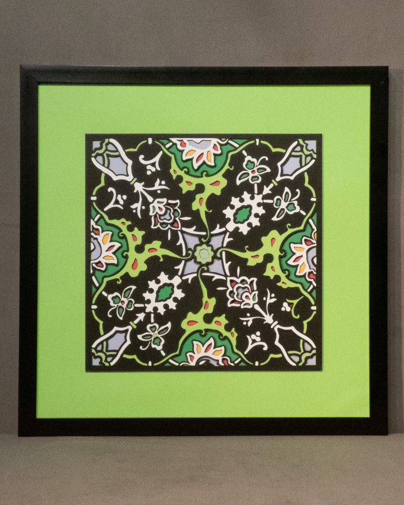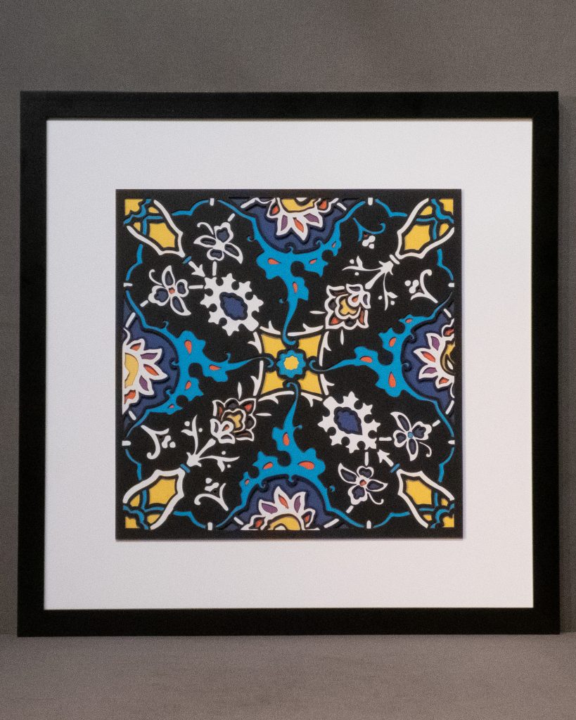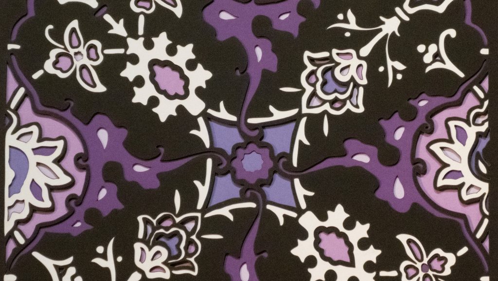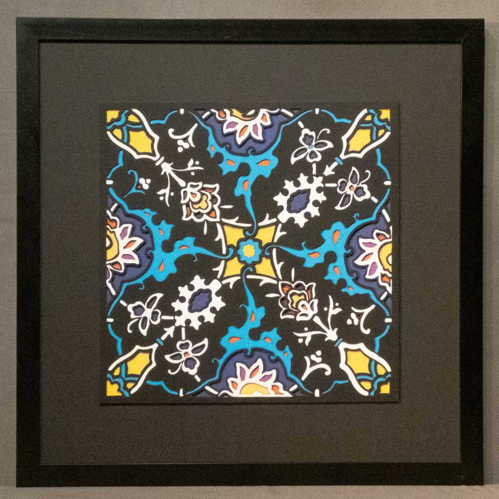Inspired by a 17th century tile from the Egyptian mosque frequented by the Sufi order of the Whirling Dervishes who spun in repetitive circles to reach a ecstatic trance, this design unfolds across 8 layered sheets of paper.