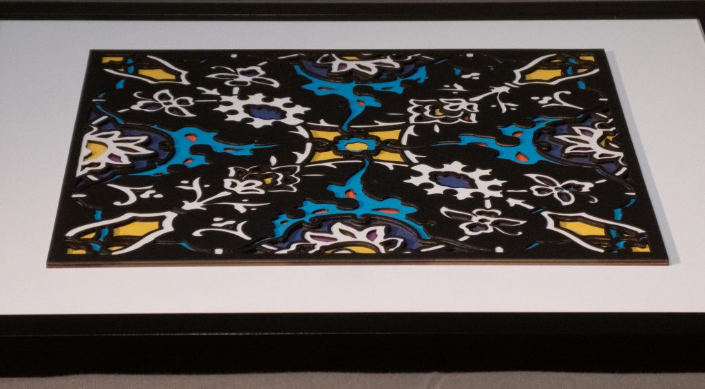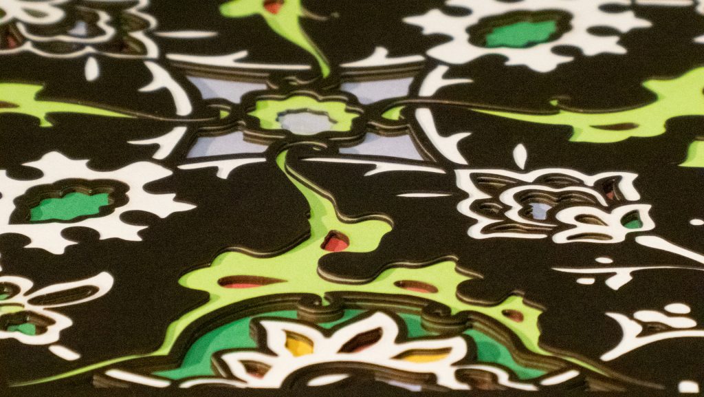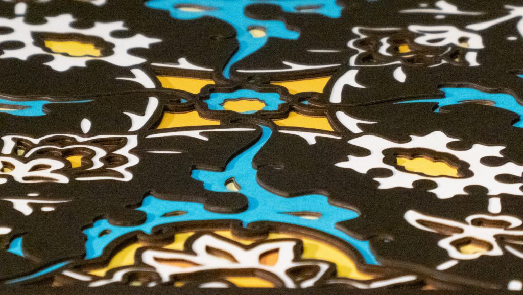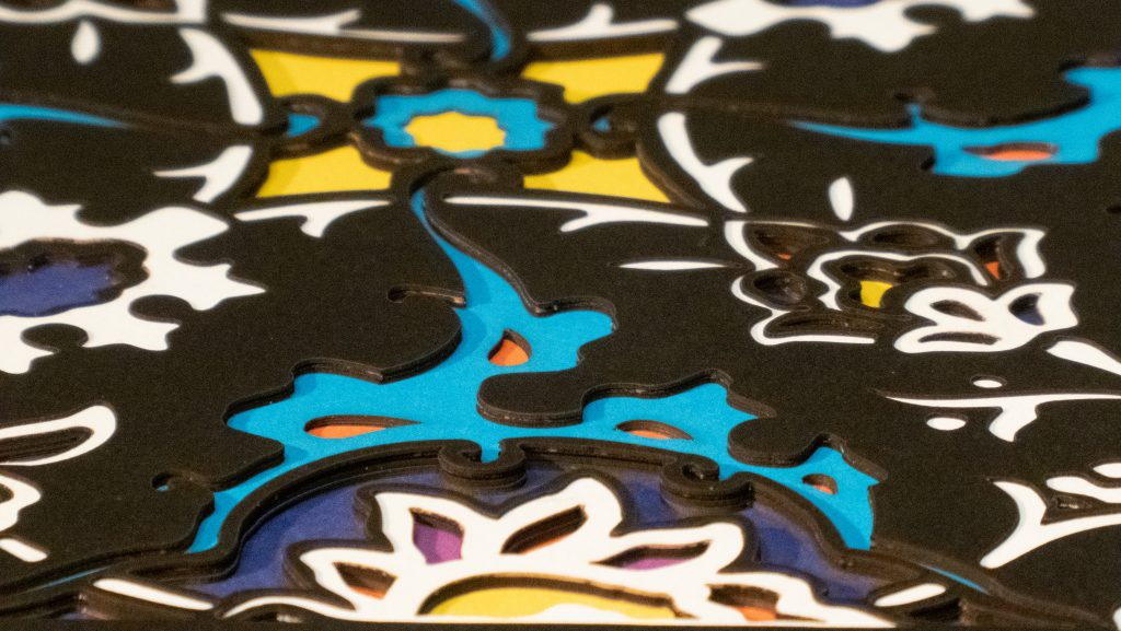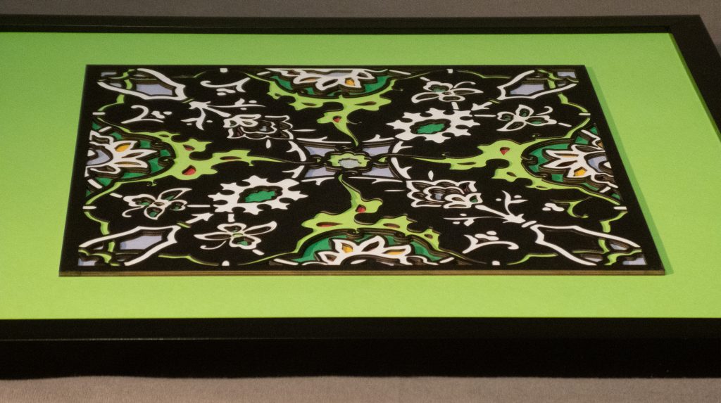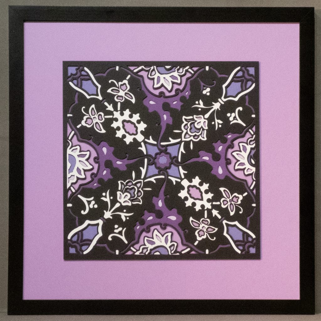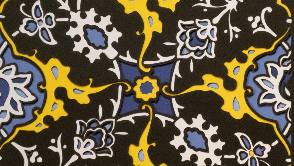 Inspired by a 17th century tile from the Egyptian mosque frequented by the Sufi order of the Whirling Dervishes who spun in repetitive circles to reach a ecstatic trance, this design unfolds across 8 layered sheets of paper.