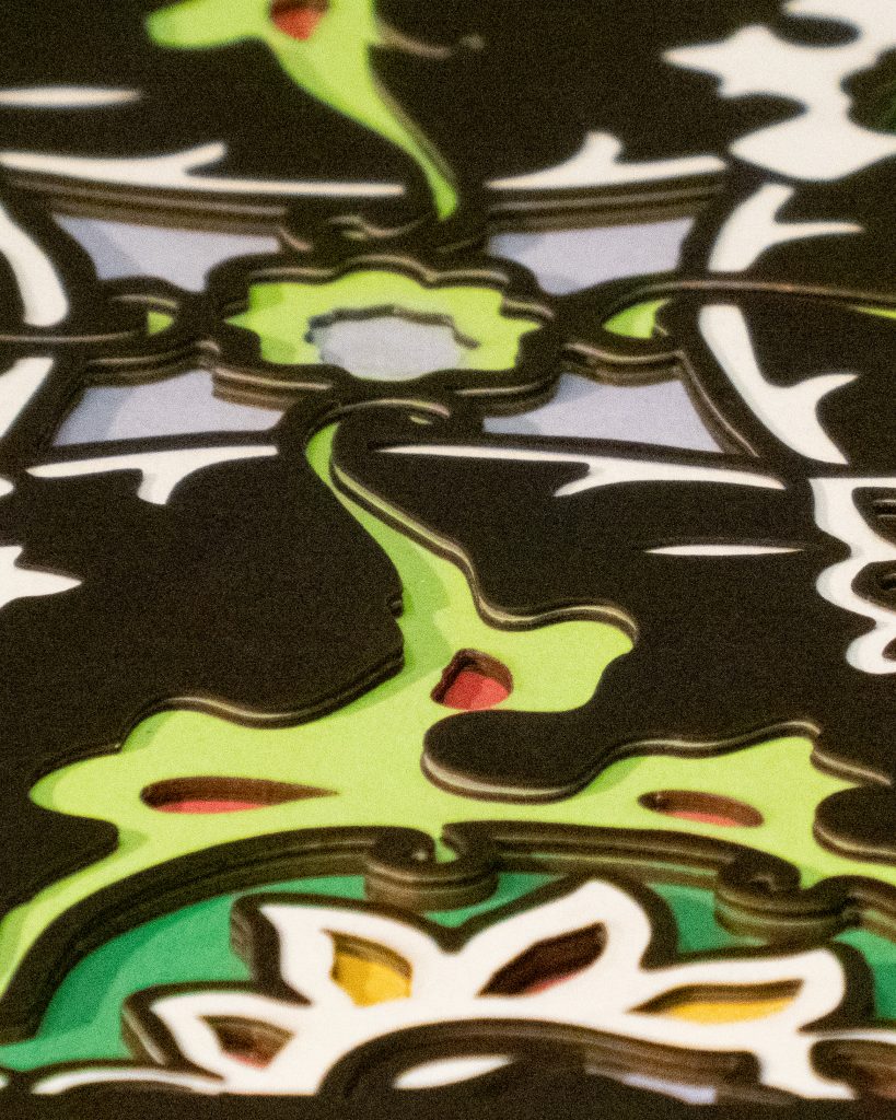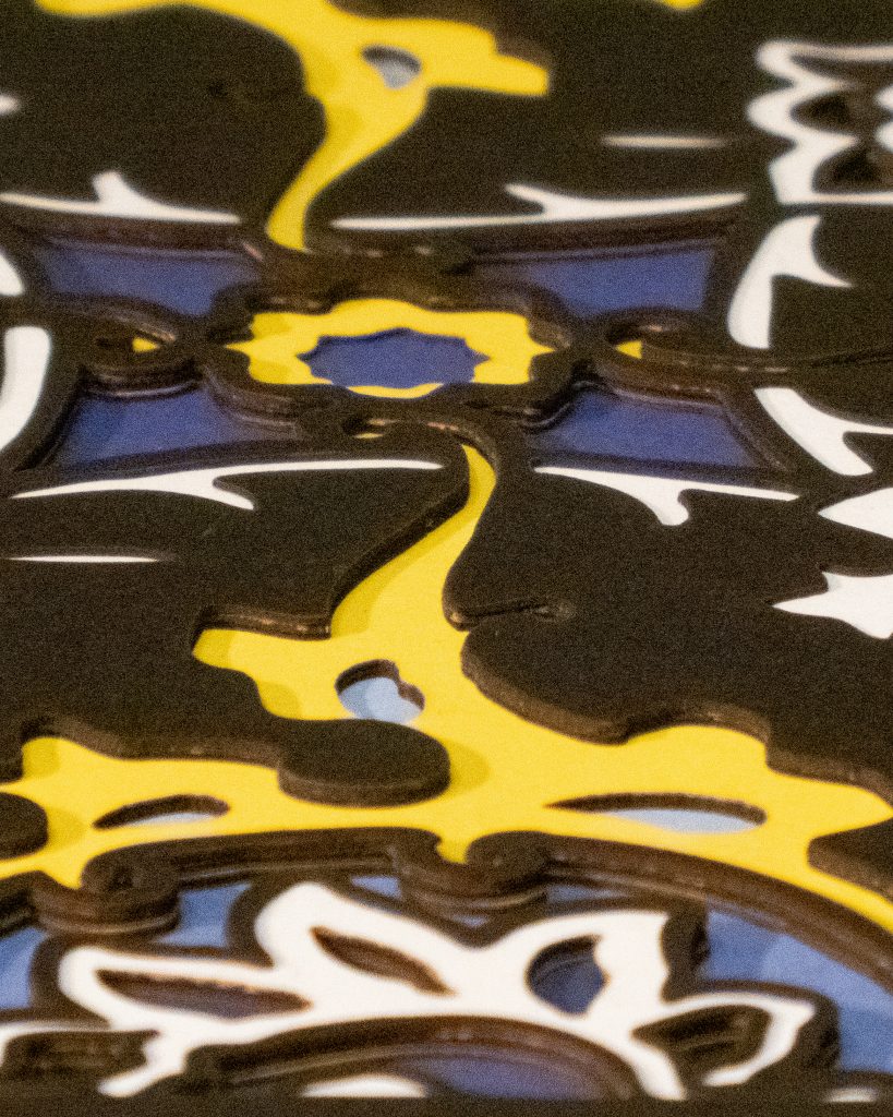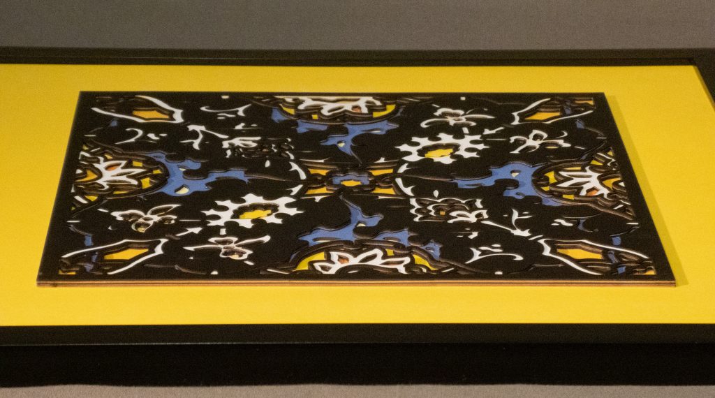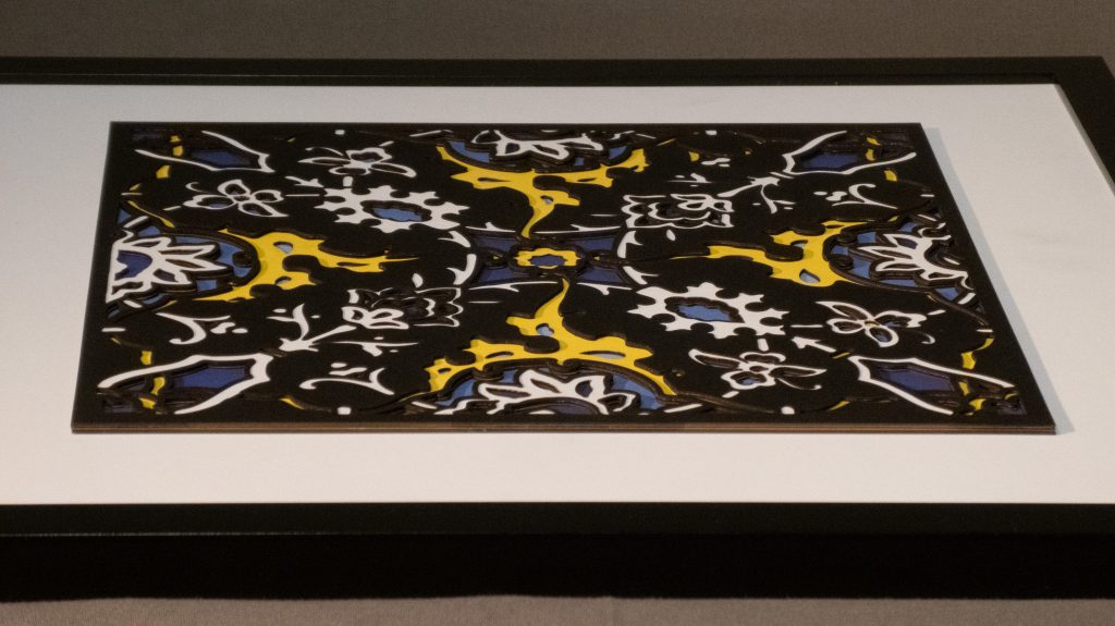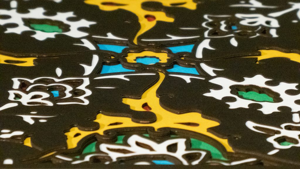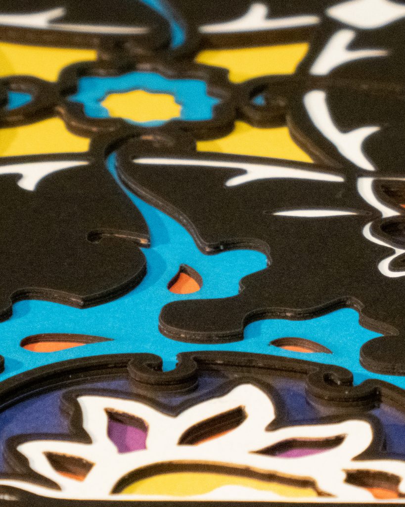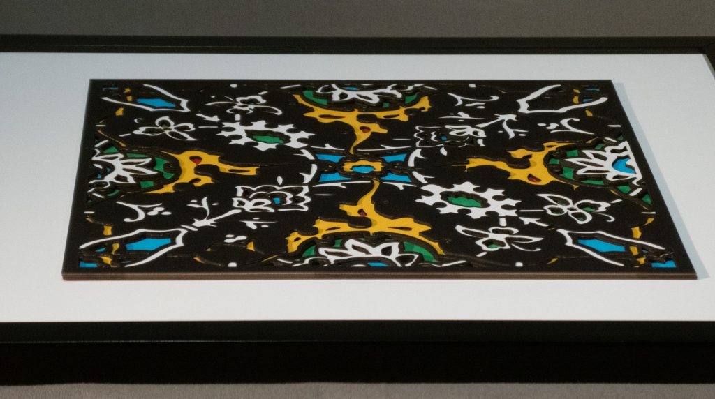 Inspired by a 17th century tile from the Egyptian mosque frequented by the Sufi order of the Whirling Dervishes who spun in repetitive circles to reach a ecstatic trance, this design unfolds across 8 layered sheets of paper.