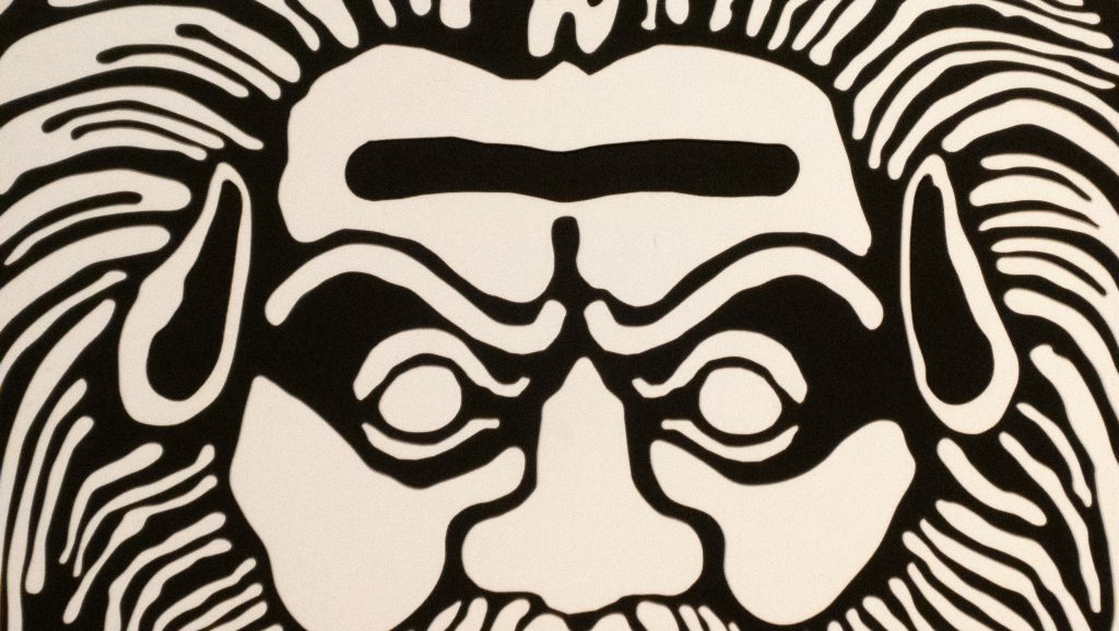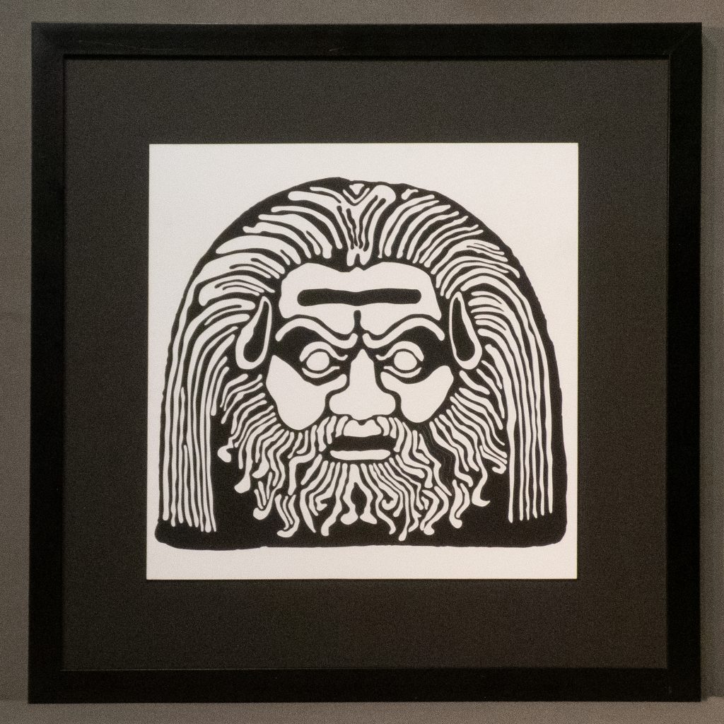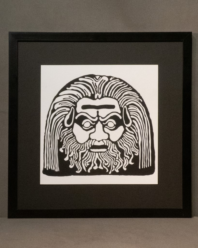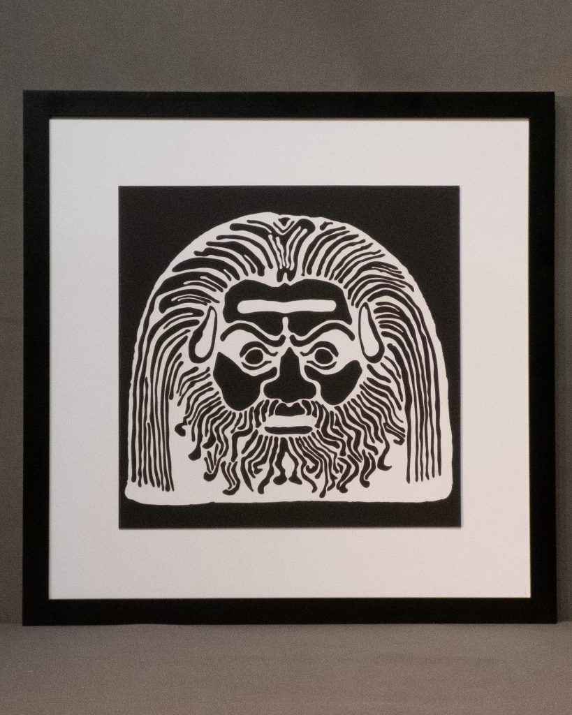 A reimagining of an Italian 3rd century BCE decorative terracotta roof tile, the white on black and black on white versions draw differing emotional responses, appearing as either benign or malevolent.
