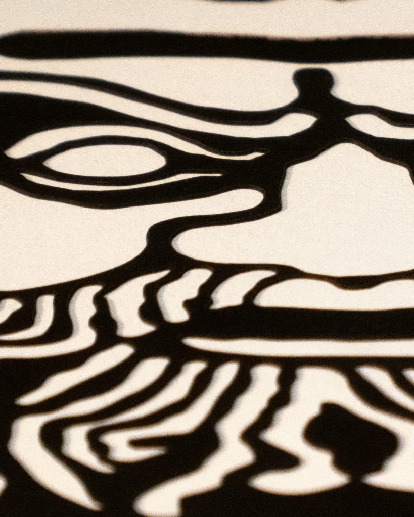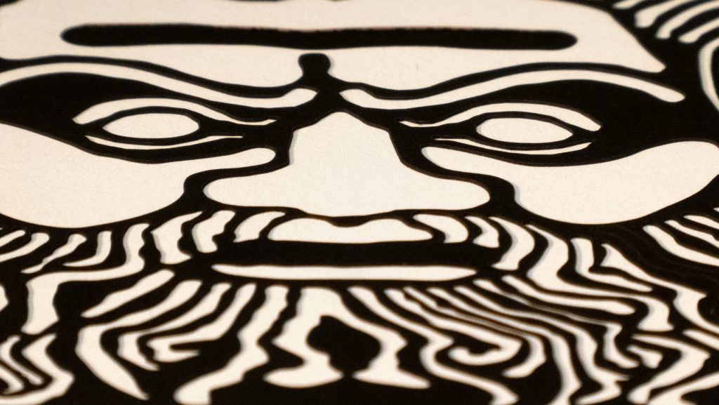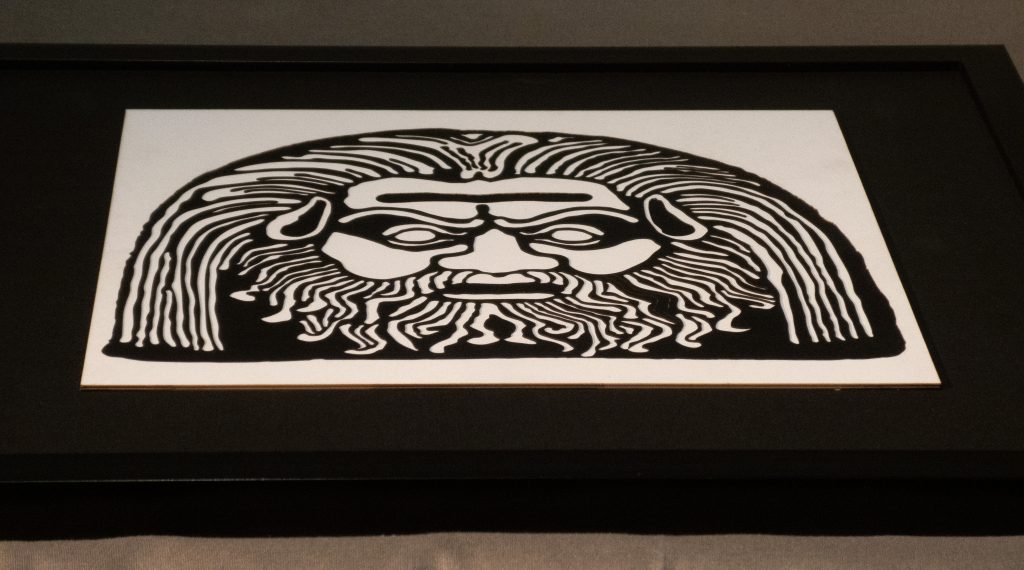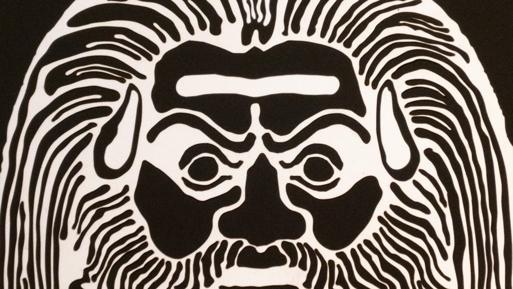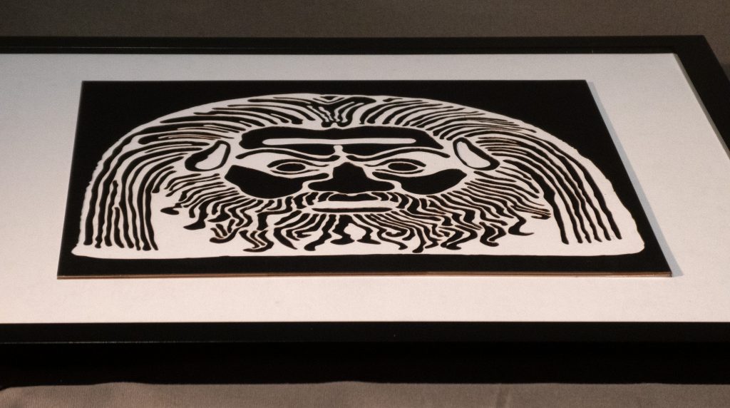 A reimagining of an Italian 3rd century BCE decorative terracotta roof tile, the white on black and black on white versions draw differing emotional responses, appearing as either benign or malevolent.
